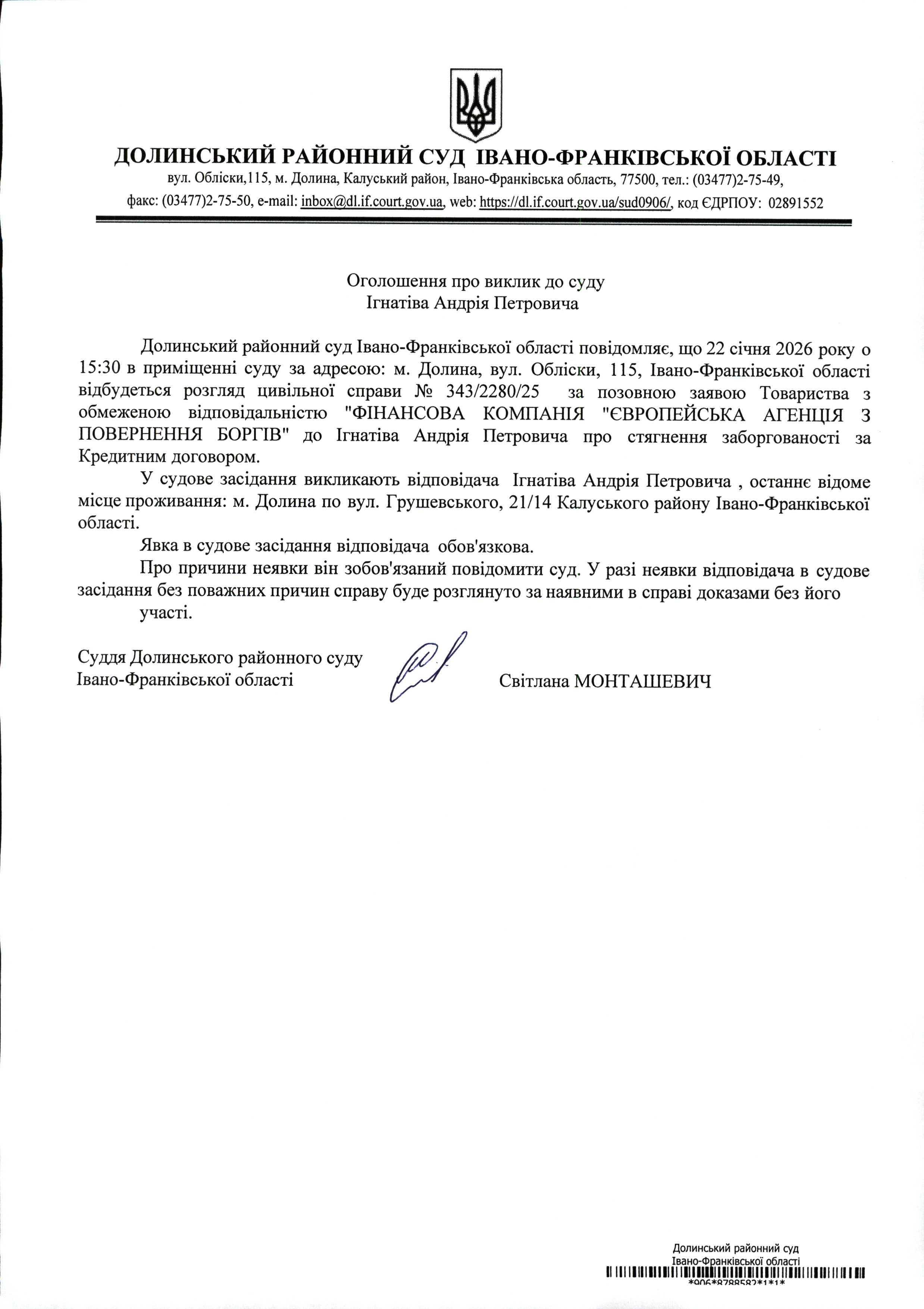 ОГОЛОШЕННЯ ПРО ВИКЛИК до СУДУ Ігнатіва Андрія Петровича у цивільній справі № 343/2280/25