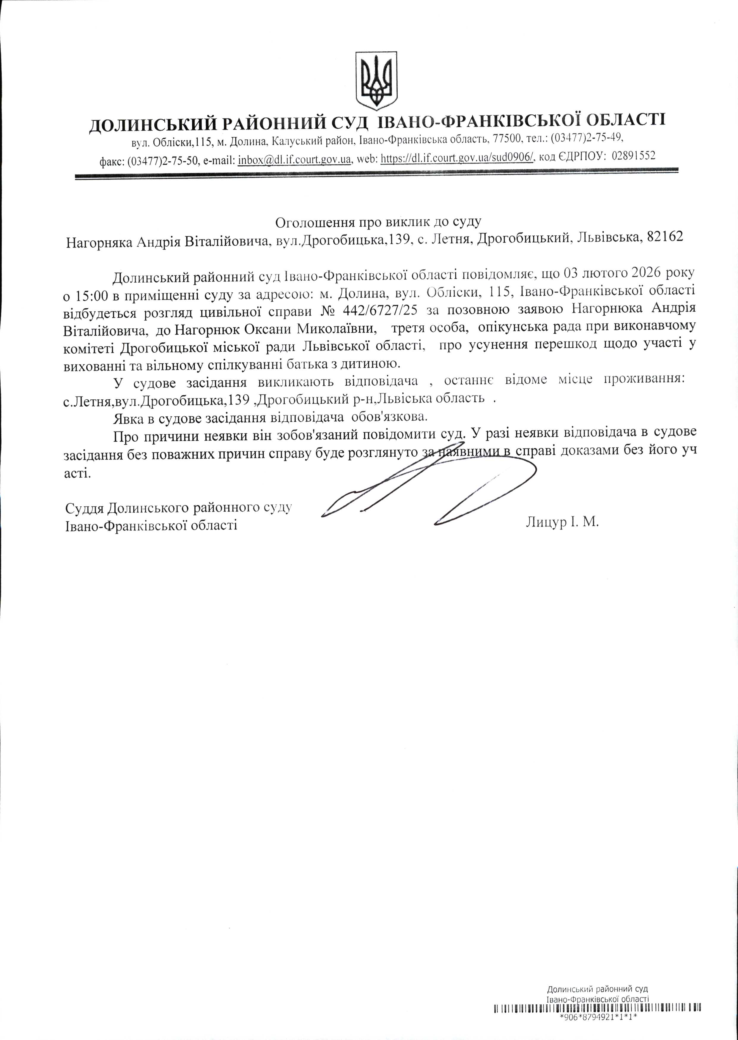 ОГОЛОШЕННЯ ПРО ВИКЛИК до СУДУ Нагорняка Андрія Віталійовича у цивільній справі № 442/6727/25