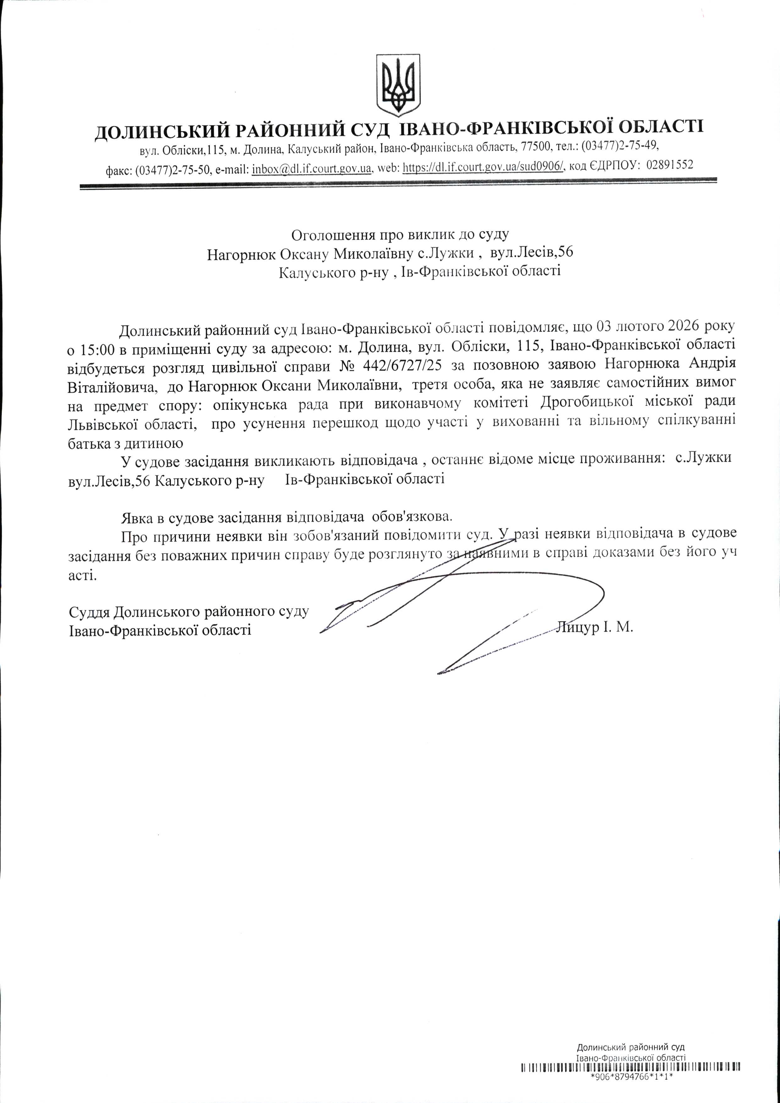 ОГОЛОШЕННЯ ПРО ВИКЛИК до СУДУ Нагорнюк Оксану Миколаївну у цивільній справі № 442/6727/25