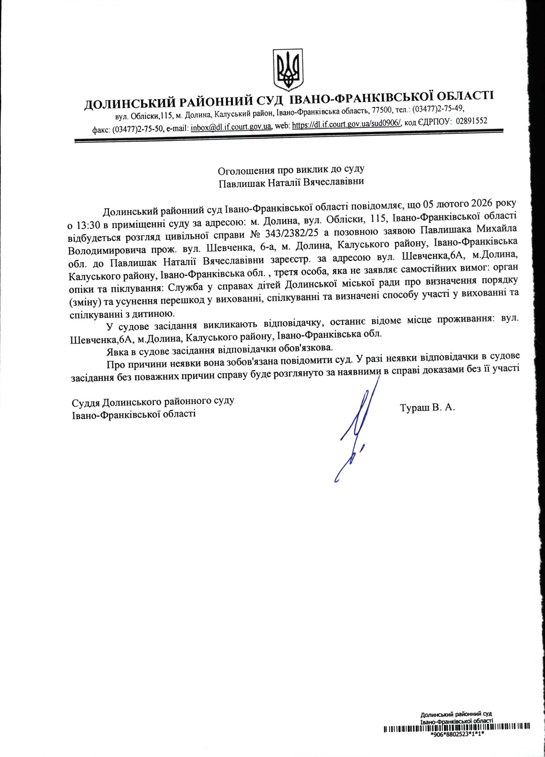 ОГОЛОШЕННЯ ПРО ВИКЛИК до СУДУ Павлишак Наталії Вячиславівни у цивільній справі № 343/2382/25