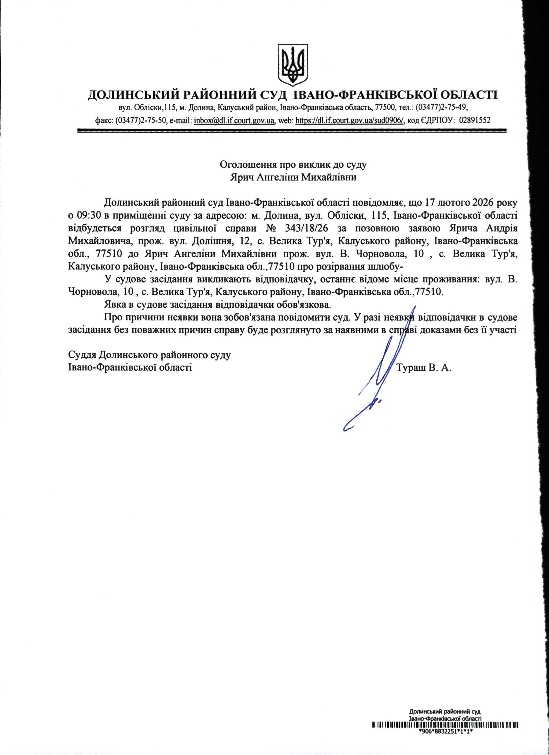 ОГОЛОШЕННЯ ПРО ВИКЛИК до СУДУ Ярич Ангеліни Михайлівни у цивільній справі № 343/18/26