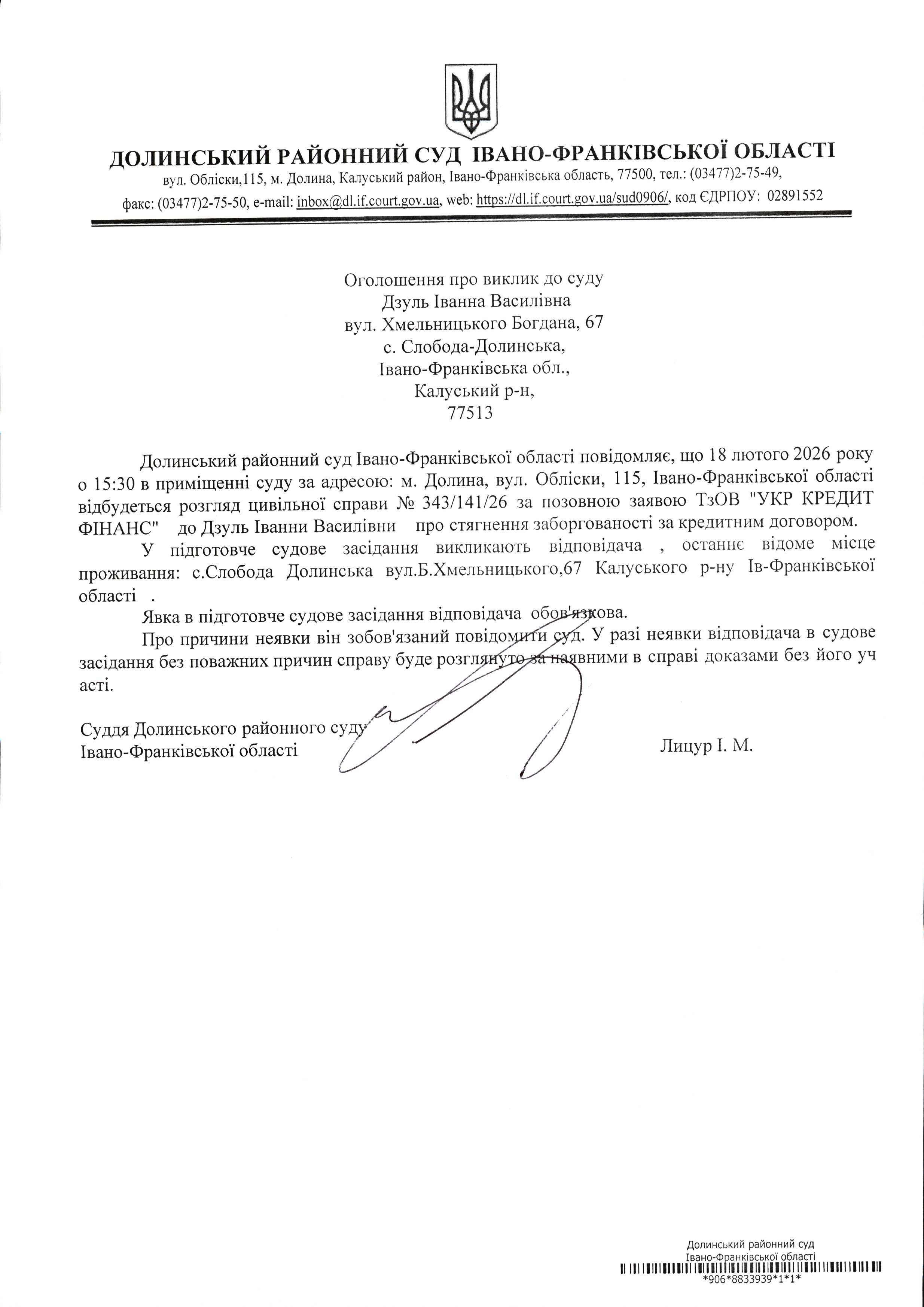 ОГОЛОШЕННЯ ПРО ВИКЛИК до СУДУ Дзуль Іванна Василівна у цивільній справі № 343/141/26
