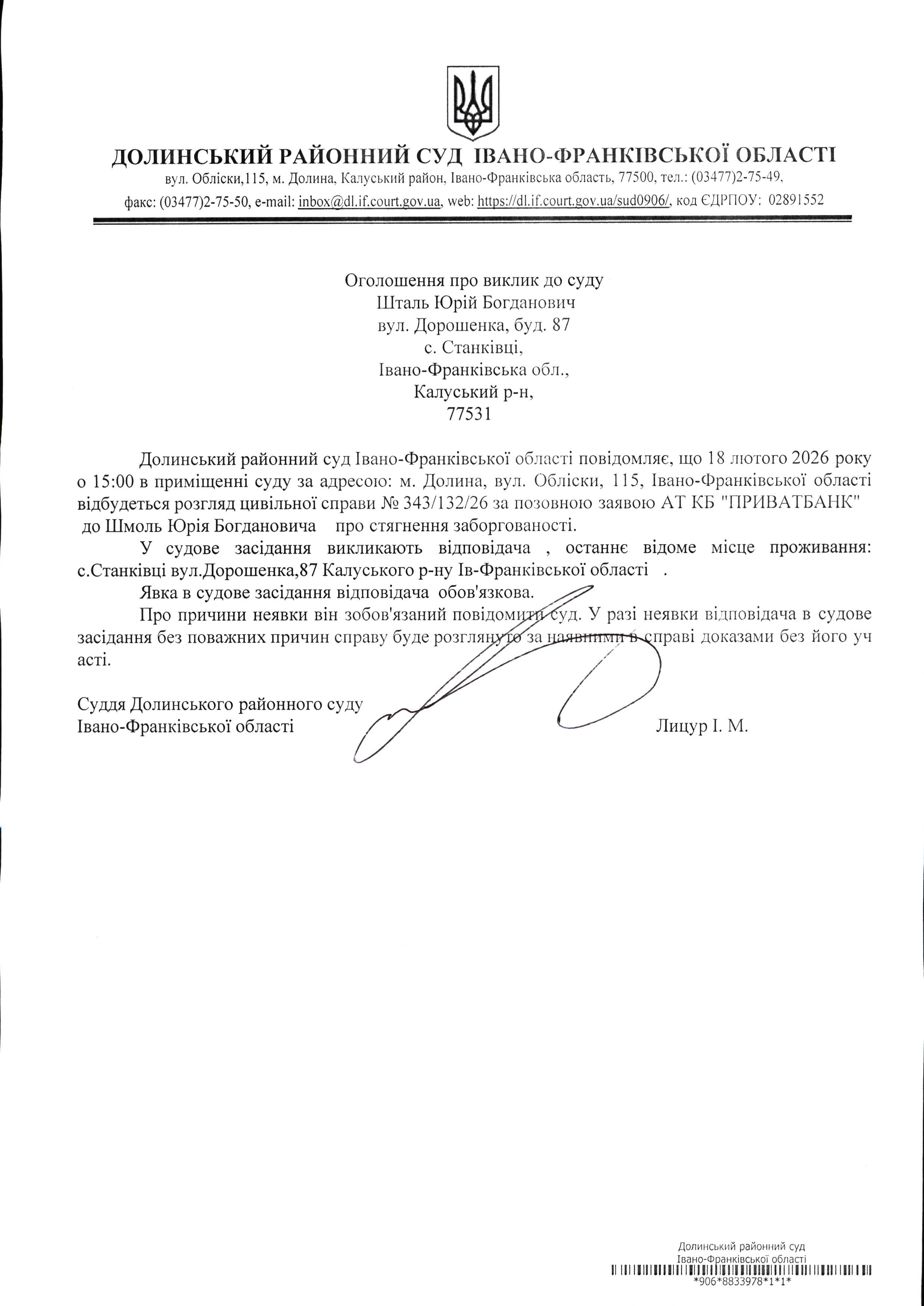 ОГОЛОШЕННЯ ПРО ВИКЛИК до СУДУ Шталь Юрій Богданович у цивільній справі № 343/132/26