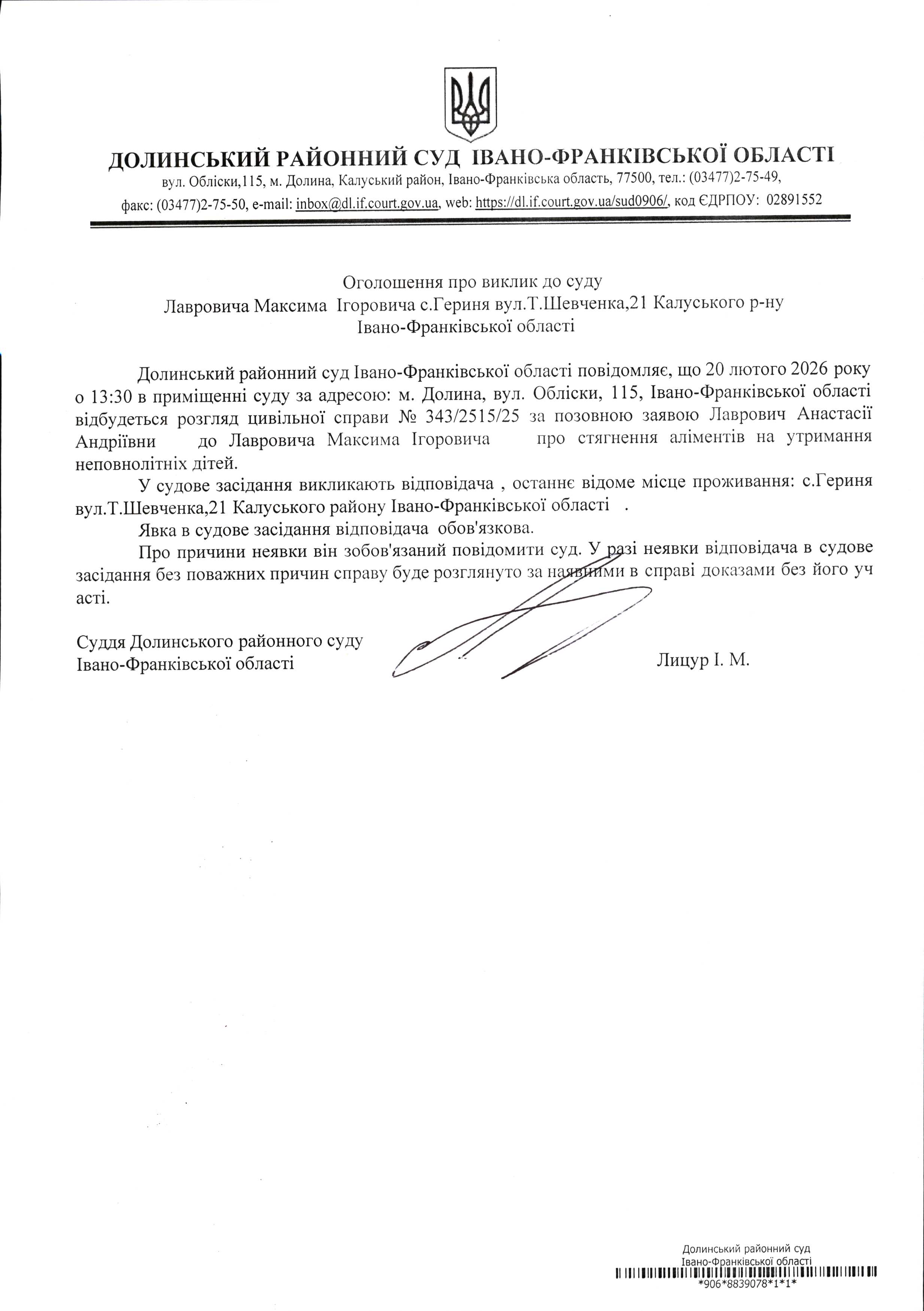 ОГОЛОШЕННЯ ПРО ВИКЛИК до СУДУ Лаврович Максима Ігоровича у цивільній справі № 343/2515/25