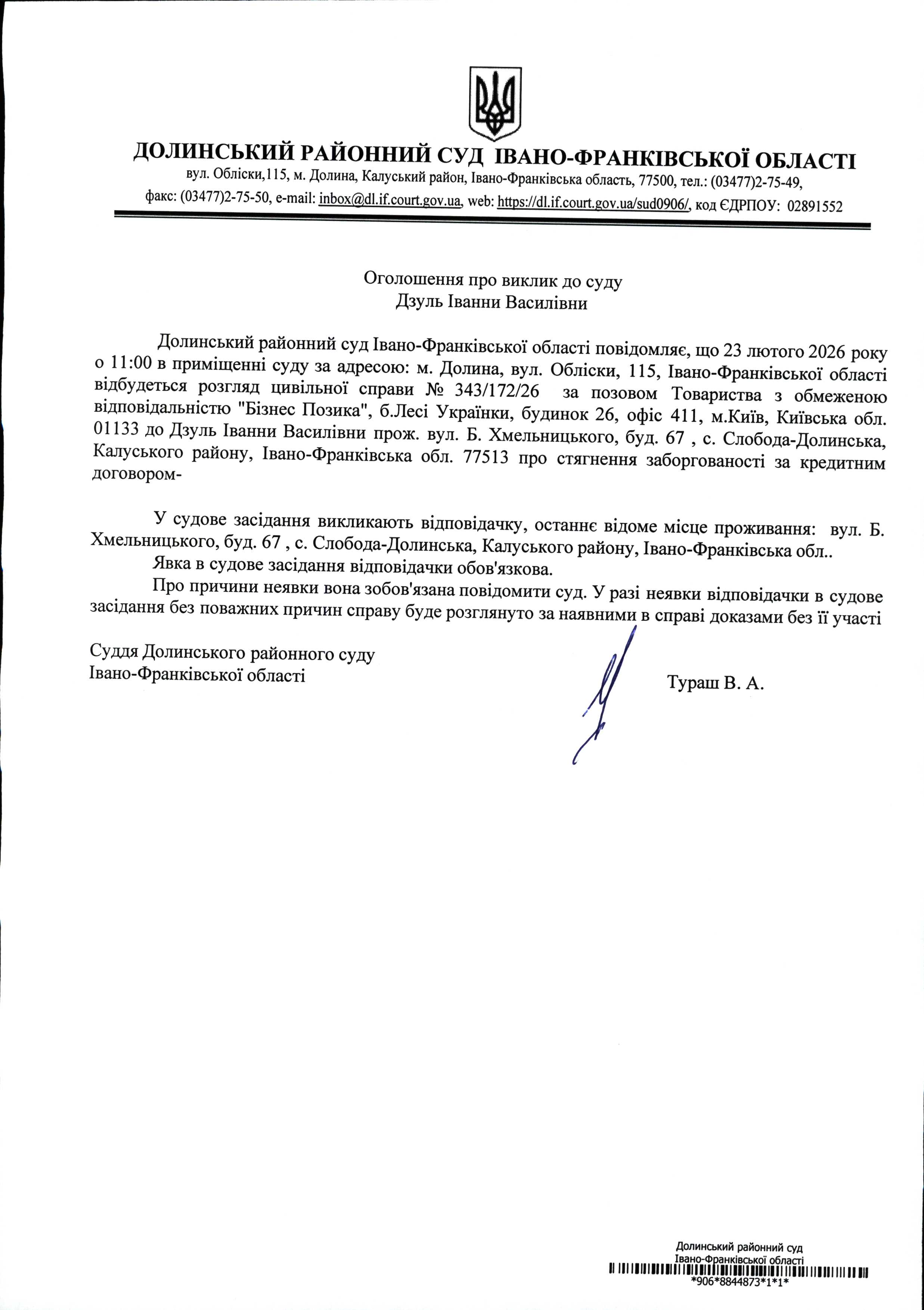 ОГОЛОШЕННЯ ПРО ВИКЛИК до СУДУ Дзуль Іванни Василівни у цивільній справі № 343/172/26