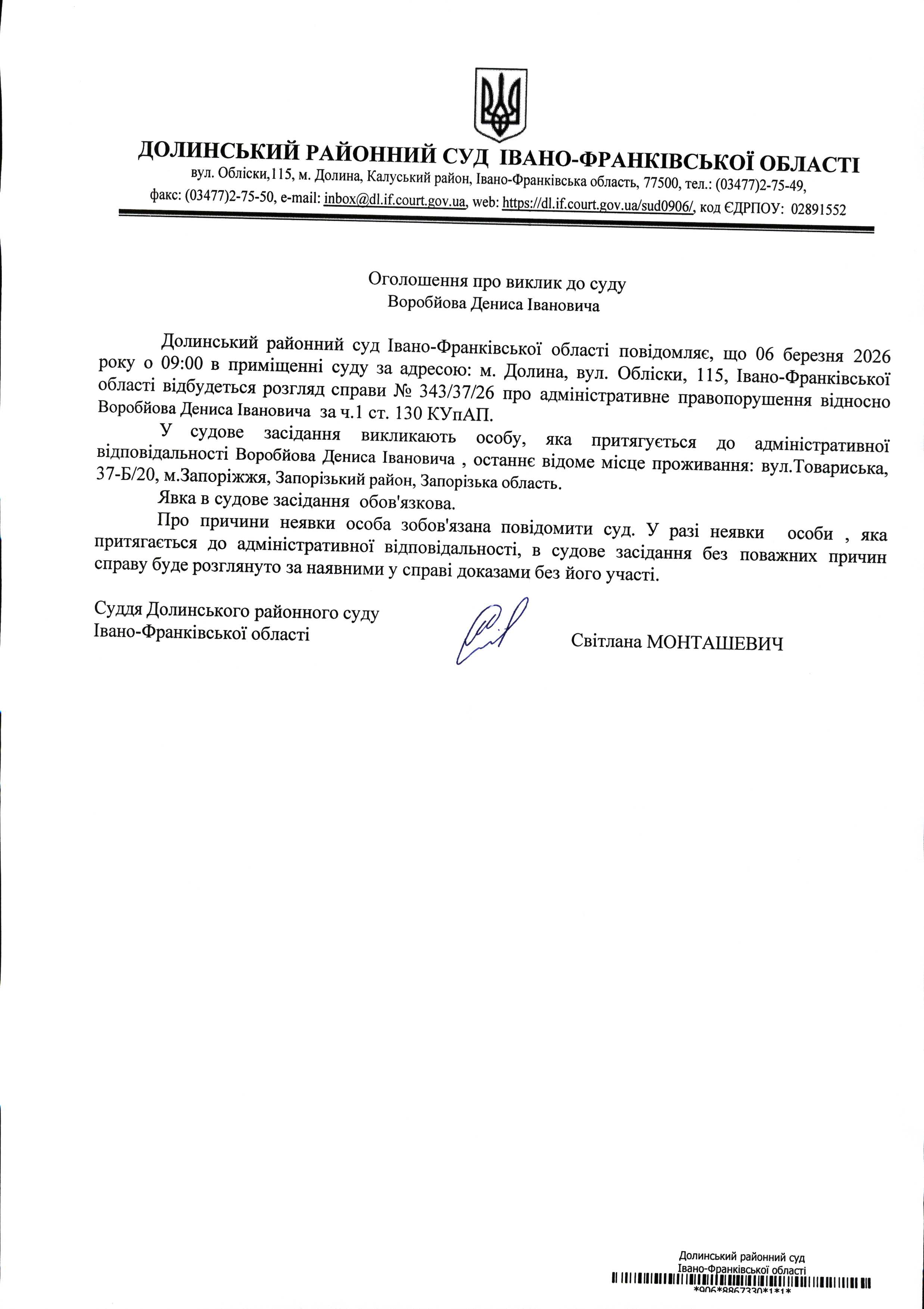 ОГОЛОШЕННЯ ПРО ВИКЛИК до СУДУ Воробйова Дениса Івановича у справі про адміністративне правопорушення № 343/37/26
