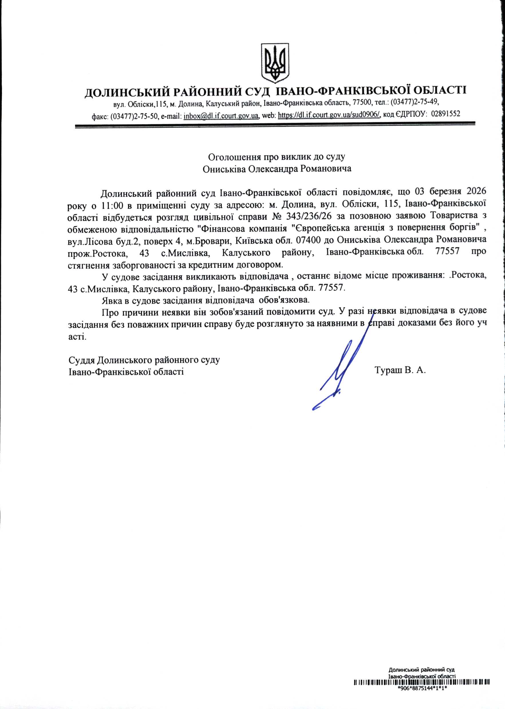 ОГОЛОШЕННЯ ПРО ВИКЛИК до СУДУ Ониськіва Олександра Романовича у цивільній справі № 343/236/26