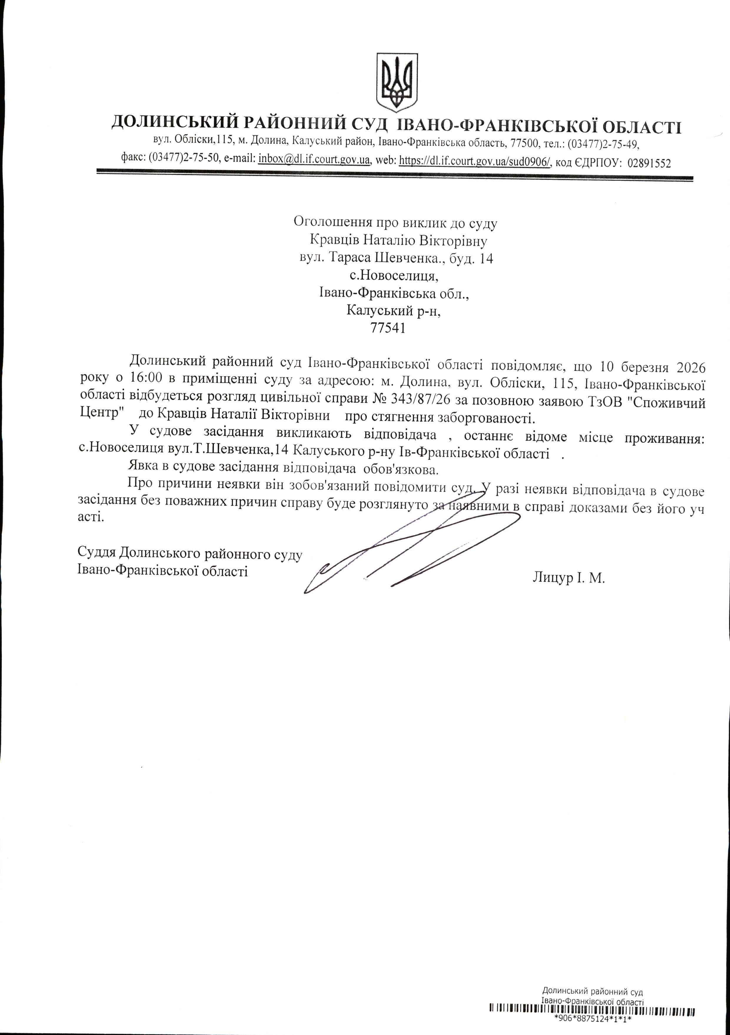 ОГОЛОШЕННЯ ПРО ВИКЛИК до СУДУ Кравців Наталію Вікторівну у цивільній справі № 343/87/26