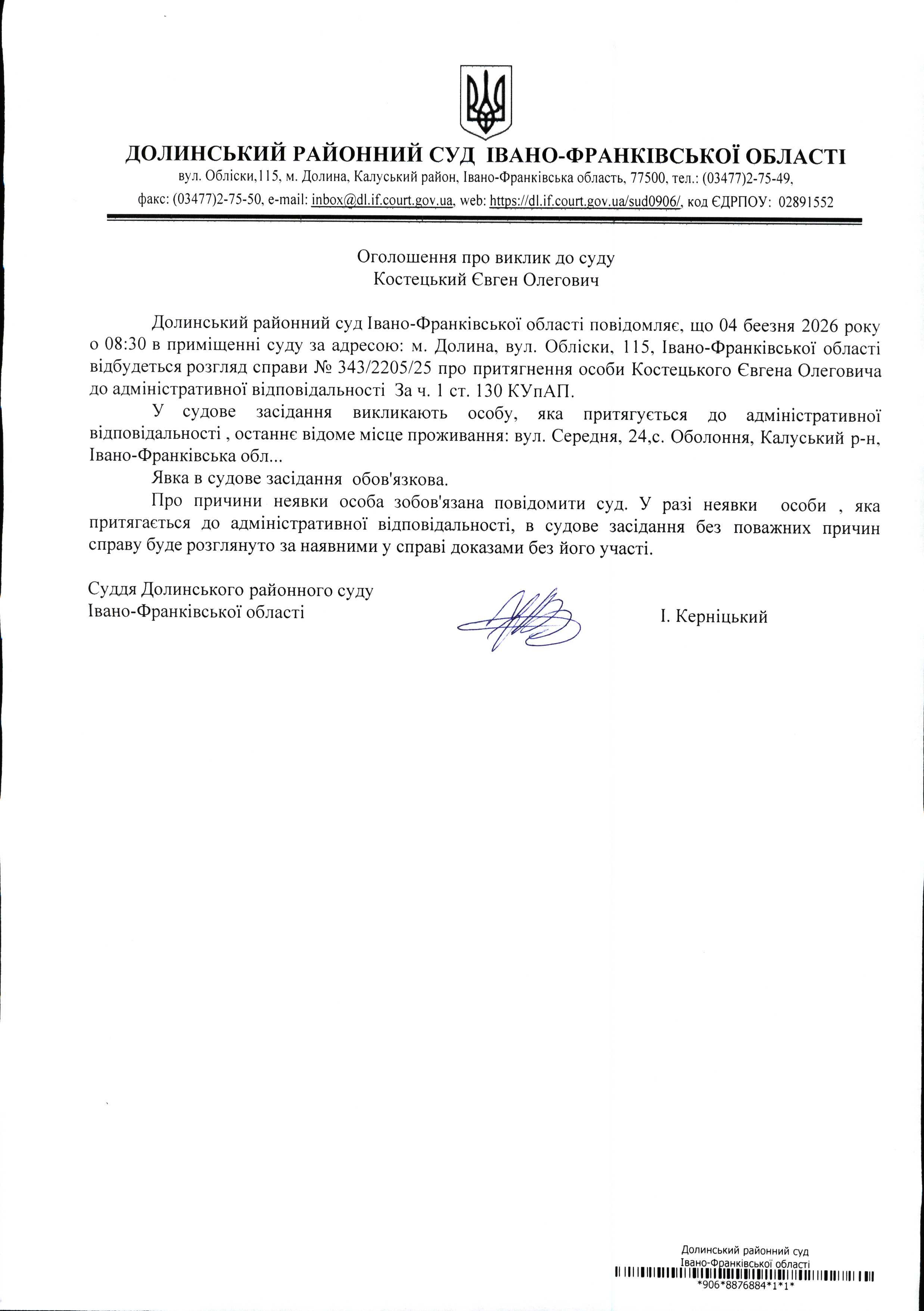 ОГОЛОШЕННЯ ПРО ВИКЛИК до СУДУ Костецький Євген Олегович у справі про адміністративне правопорушення № 343/2205/25