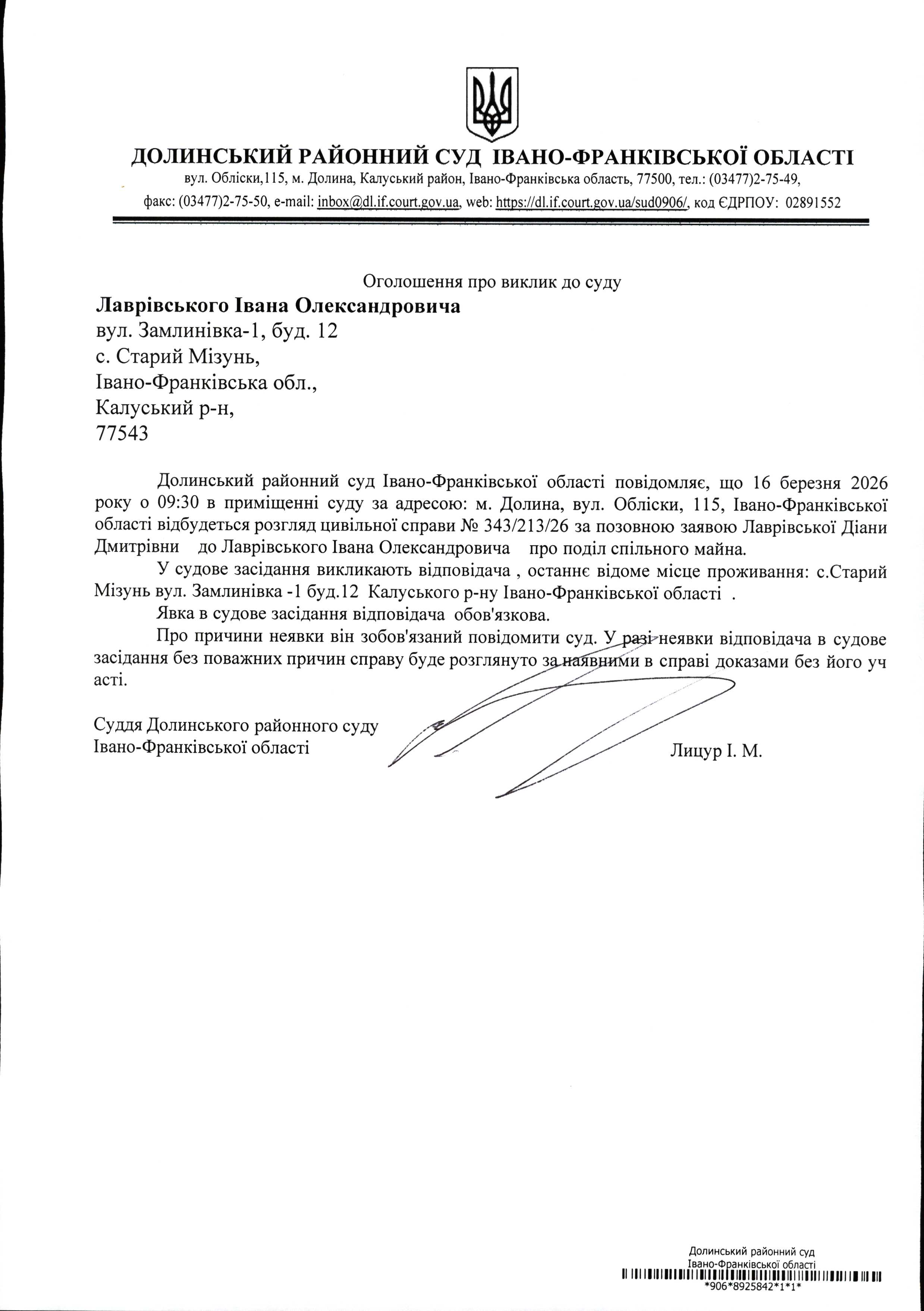ОГОЛОШЕННЯ ПРО ВИКЛИК до СУДУ Лаврівського Івана Олександровича у цивільній справі № 343/213/26
