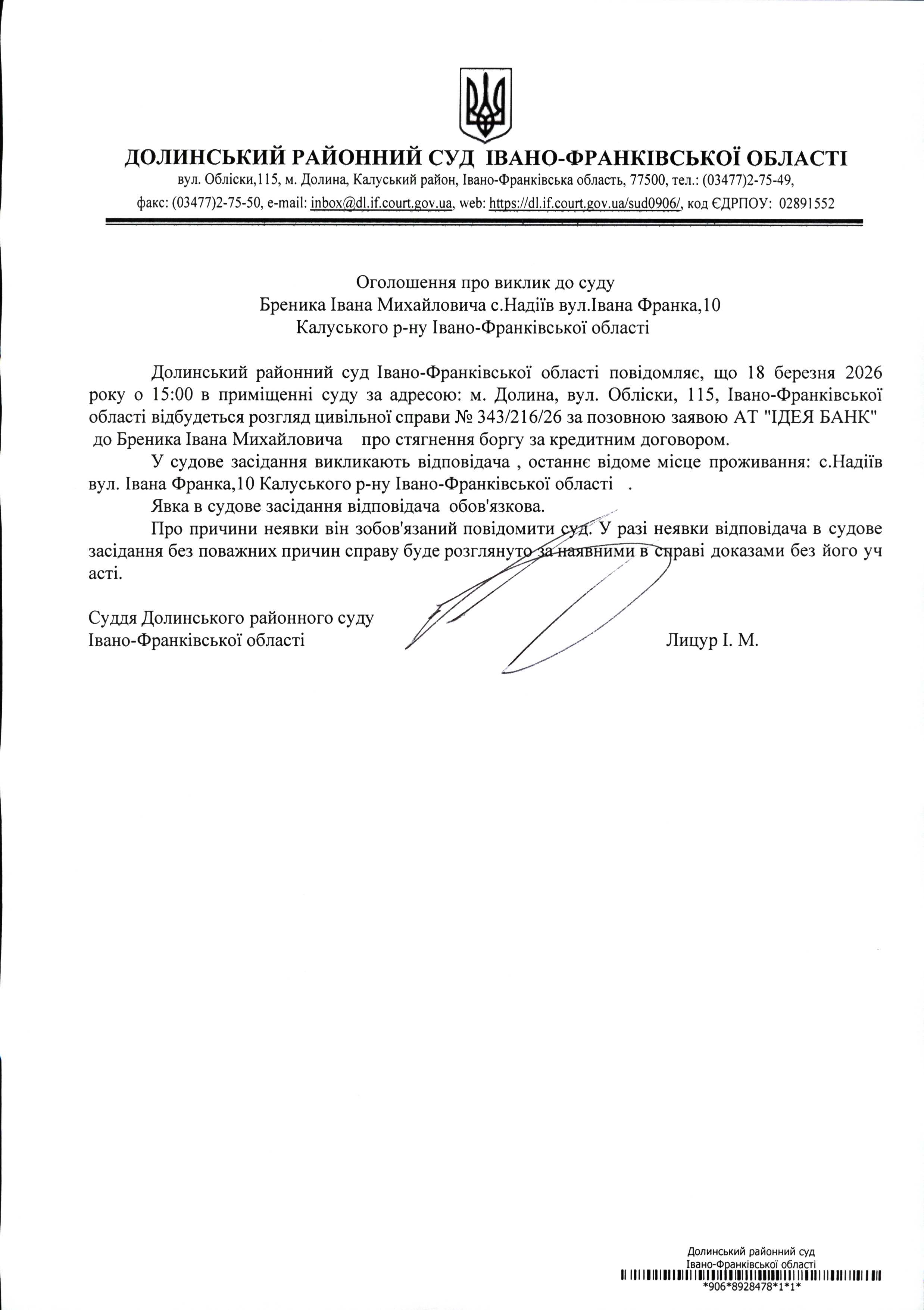 ОГОЛОШЕННЯ ПРО ВИКЛИК до СУДУ Бреника Івана Михайловича у цивільній справі № 343/216/26