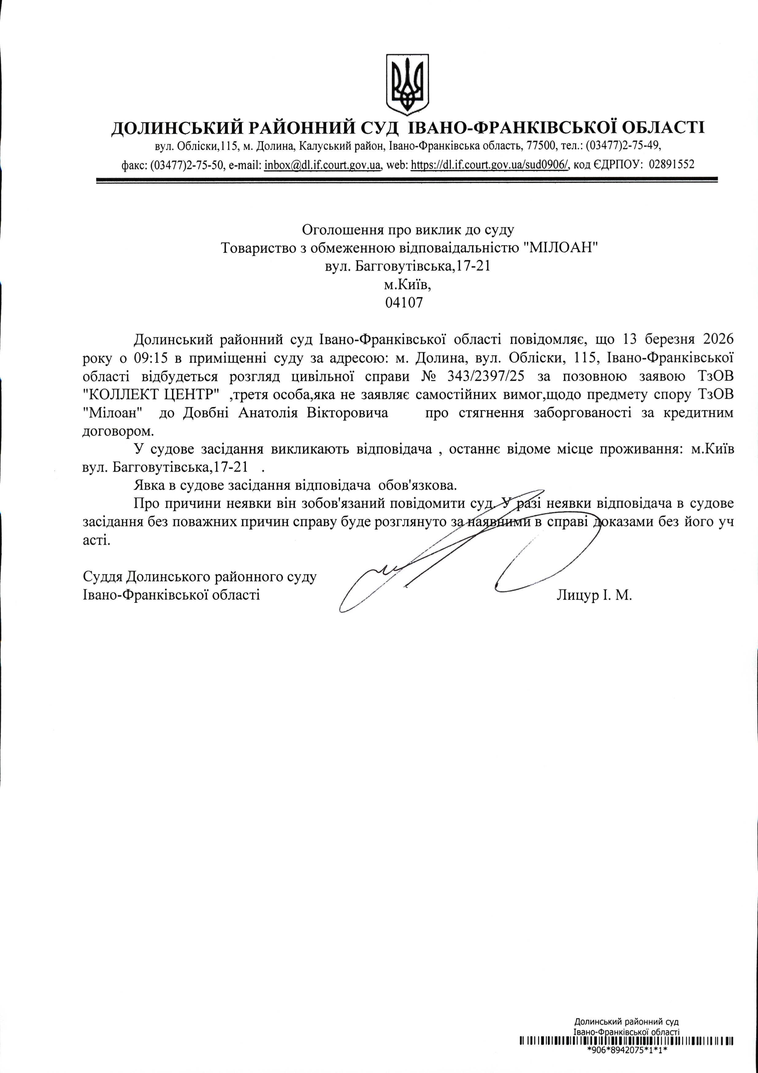 ОГОЛОШЕННЯ ПРО ВИКЛИК до СУДУ Товаристово з обмеженою відповідальністю "МІЛОАН' у цивільній справі № 343/2397/25