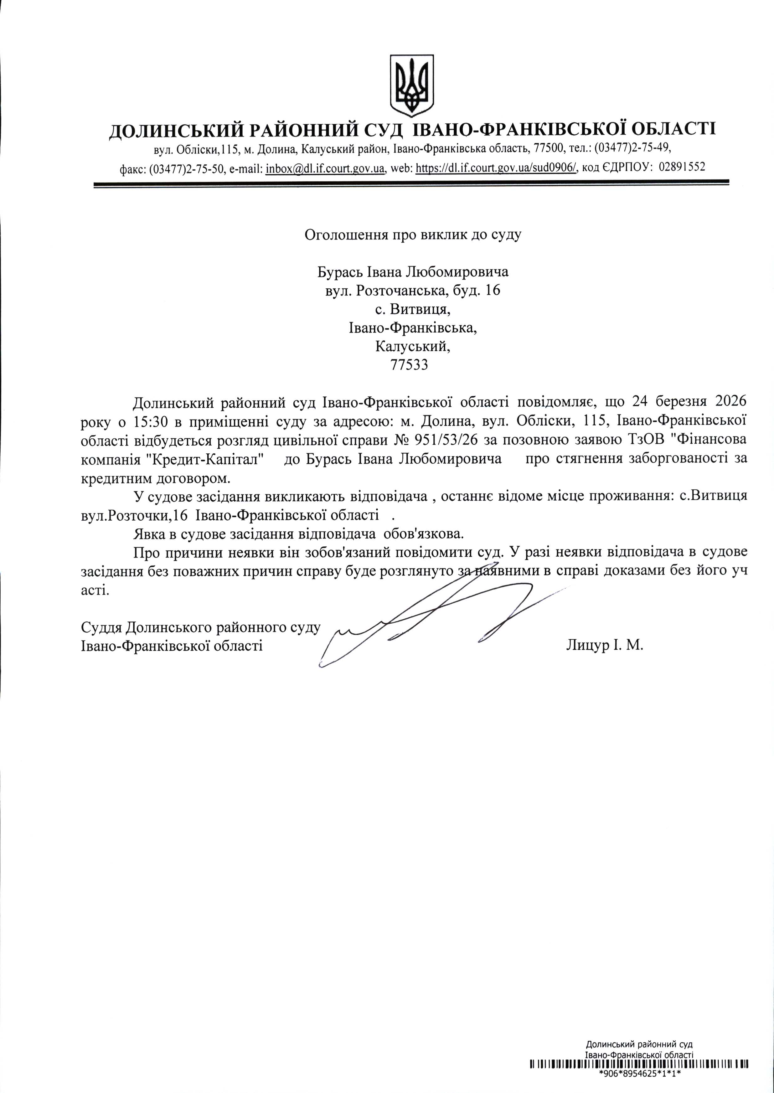 ОГОЛОШЕННЯ ПРО ВИКЛИК до СУДУ Бурась Івана Любомировича у цивільній справі № 951/53/26