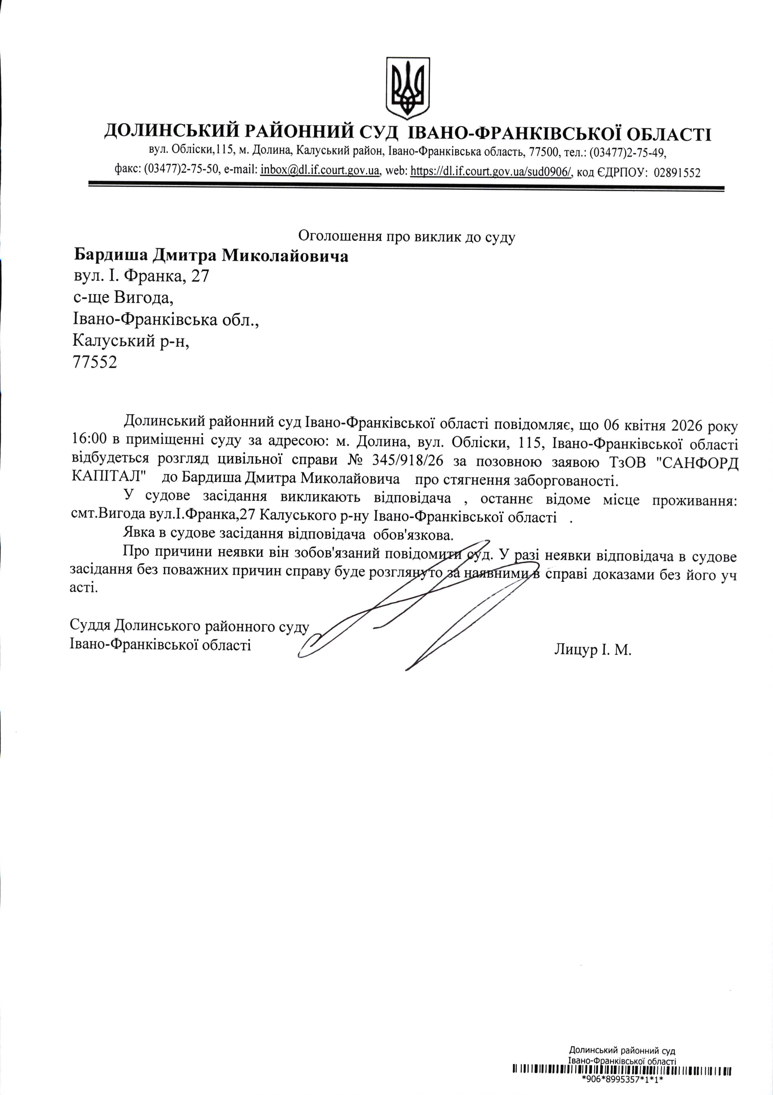 ОГОЛОШЕННЯ ПРО ВИКЛИК до СУДУ Бардиша Дмитра Миколайовича у цивільній справі № 345/918/26