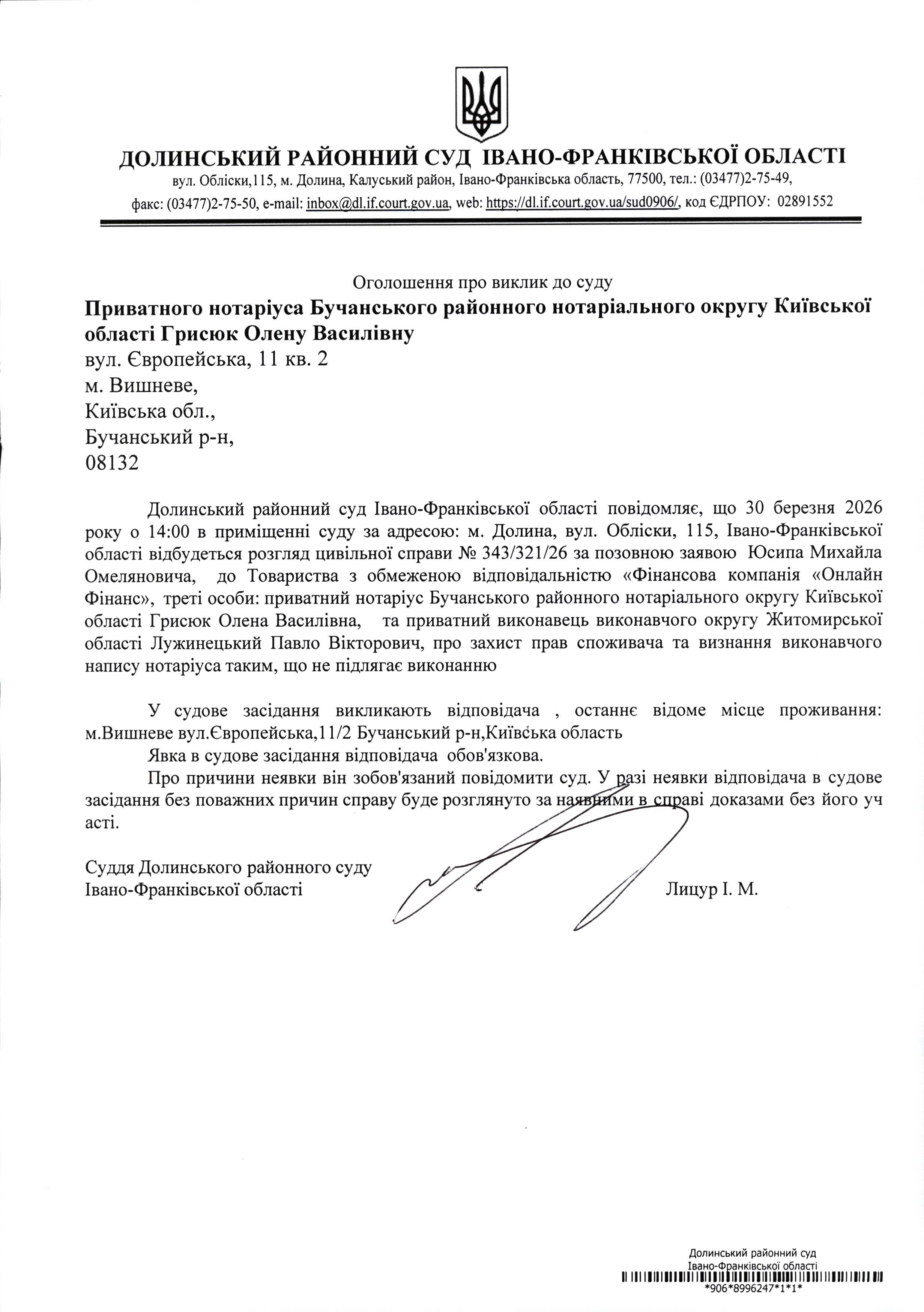 ОГОЛОШЕННЯ ПРО ВИКЛИК до СУДУ Приватного нотаріуса Бучанського районного нотаріального округу Київської області Грисюк Олену Василівну у цивільній справі № 343/321/26