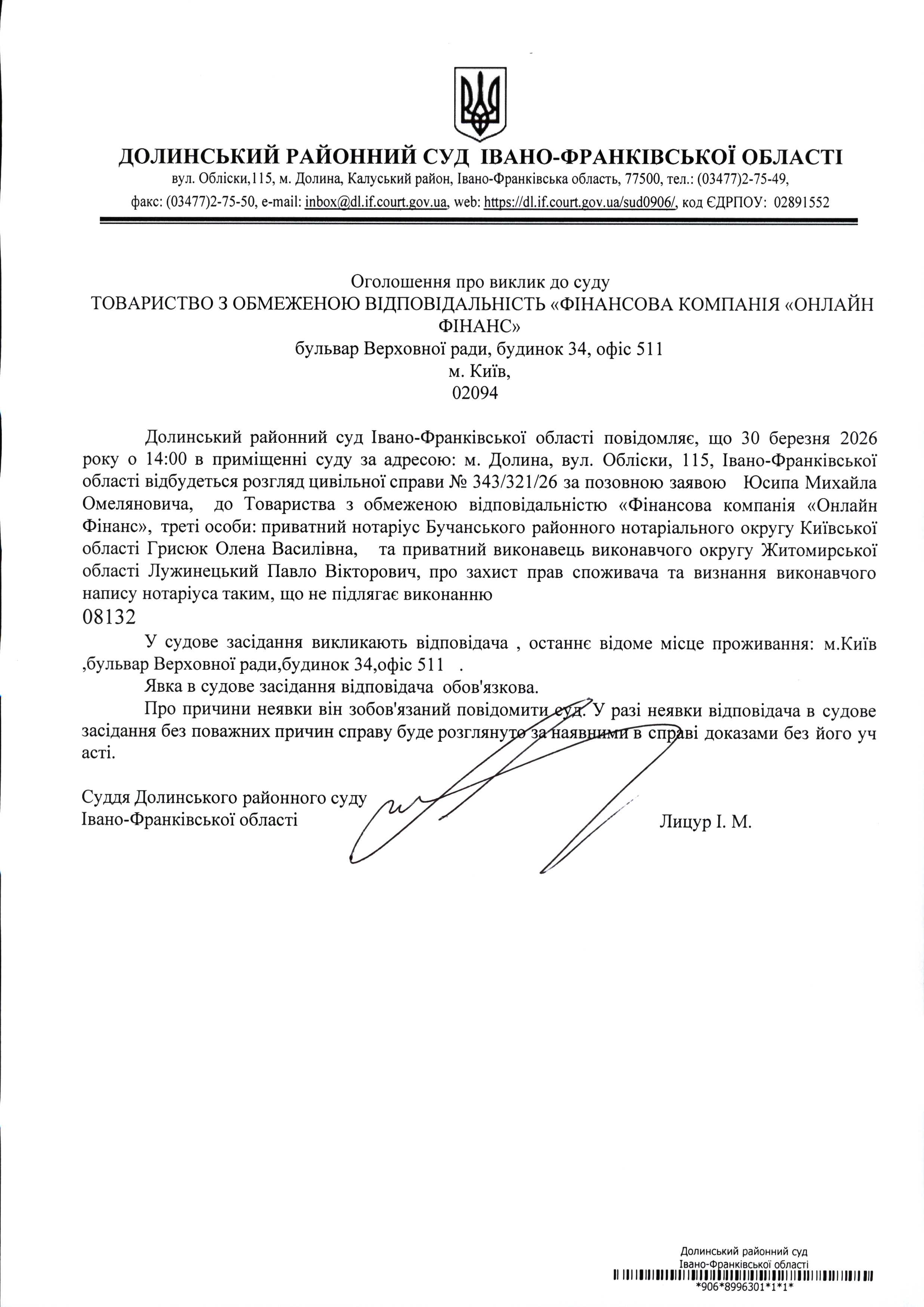 ОГОЛОШЕННЯ ПРО ВИКЛИК до СУДУ ТОВАРИСТВО З ОБМЕЖЕНОЮ ВІДПОВІДАЛЬНІСТЬ «ФІНАНСОВА КОМПАНІЯ «ОНЛАЙН ФІНАНС» у цивільній справі № 343/321/26
