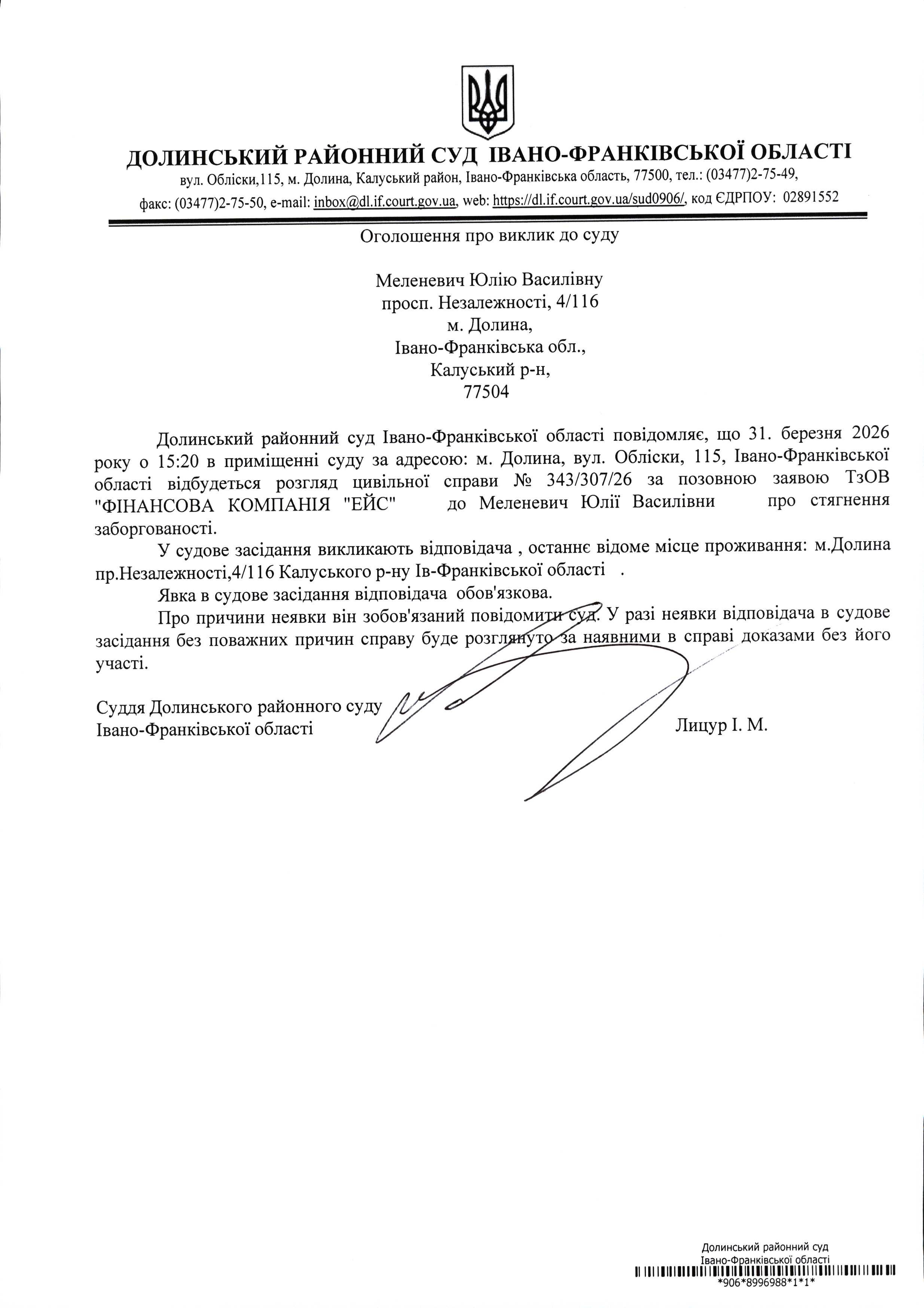 ОГОЛОШЕННЯ ПРО ВИКЛИК до СУДУ Меленевич Юлію Василівну у цивільній справі № 343/307/26