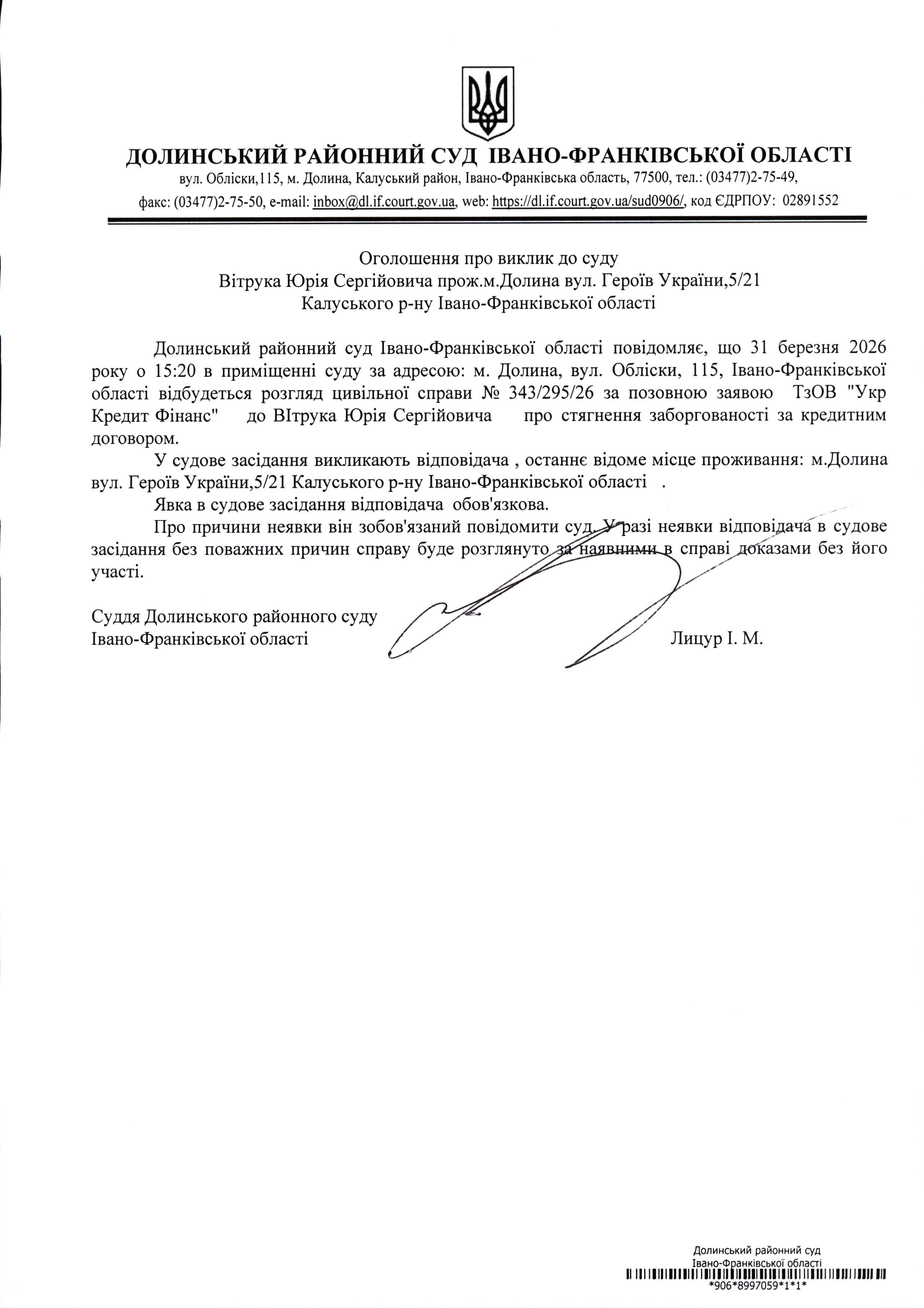 ОГОЛОШЕННЯ ПРО ВИКЛИК до СУДУ Вітрука Юрія Сергійовича у цивільній справі № 343/295/26