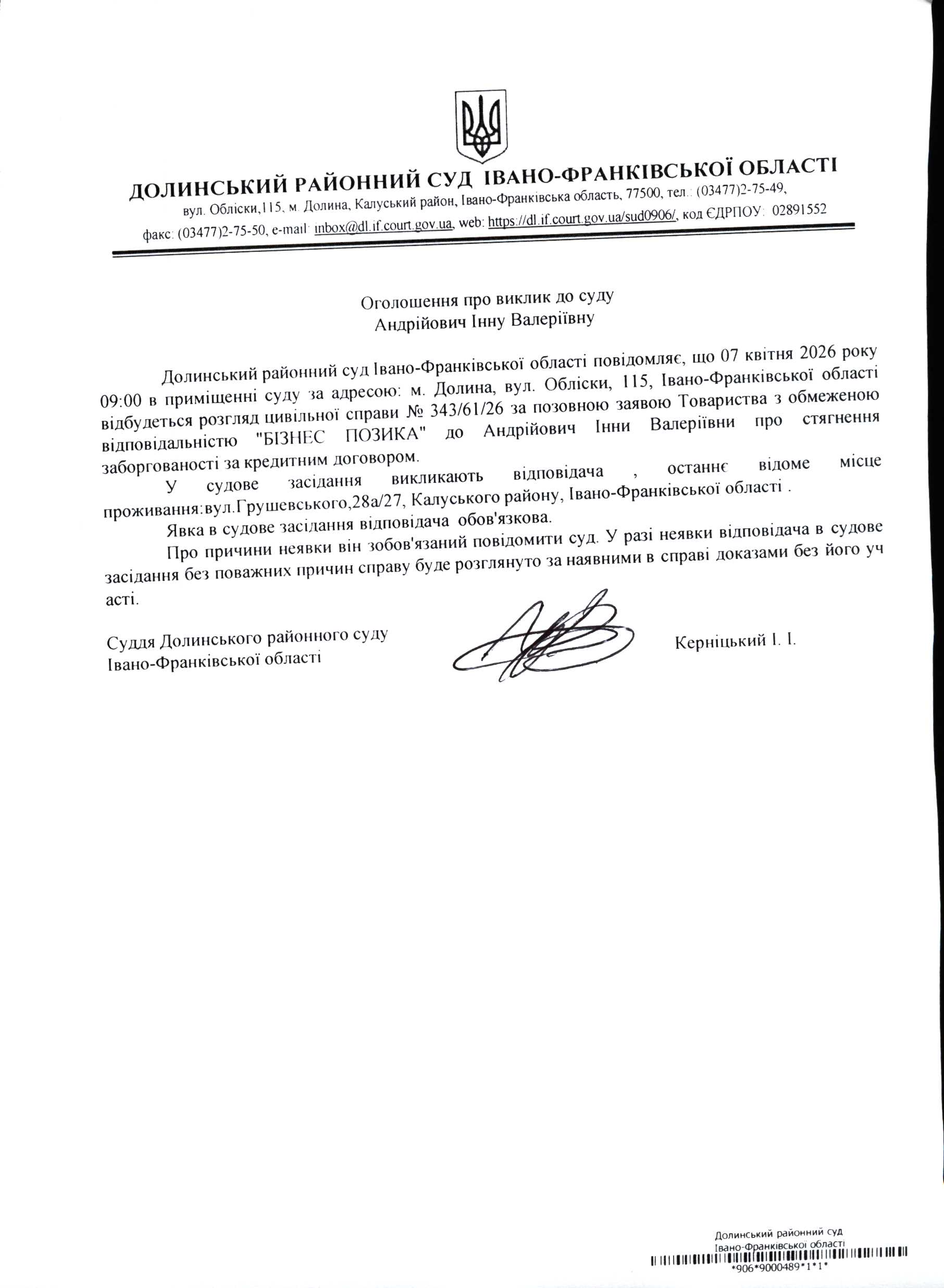 ОГОЛОШЕННЯ ПРО ВИКЛИК до СУДУ Андрійович Інну Валеріївну у цивільній справі № 343/61/26