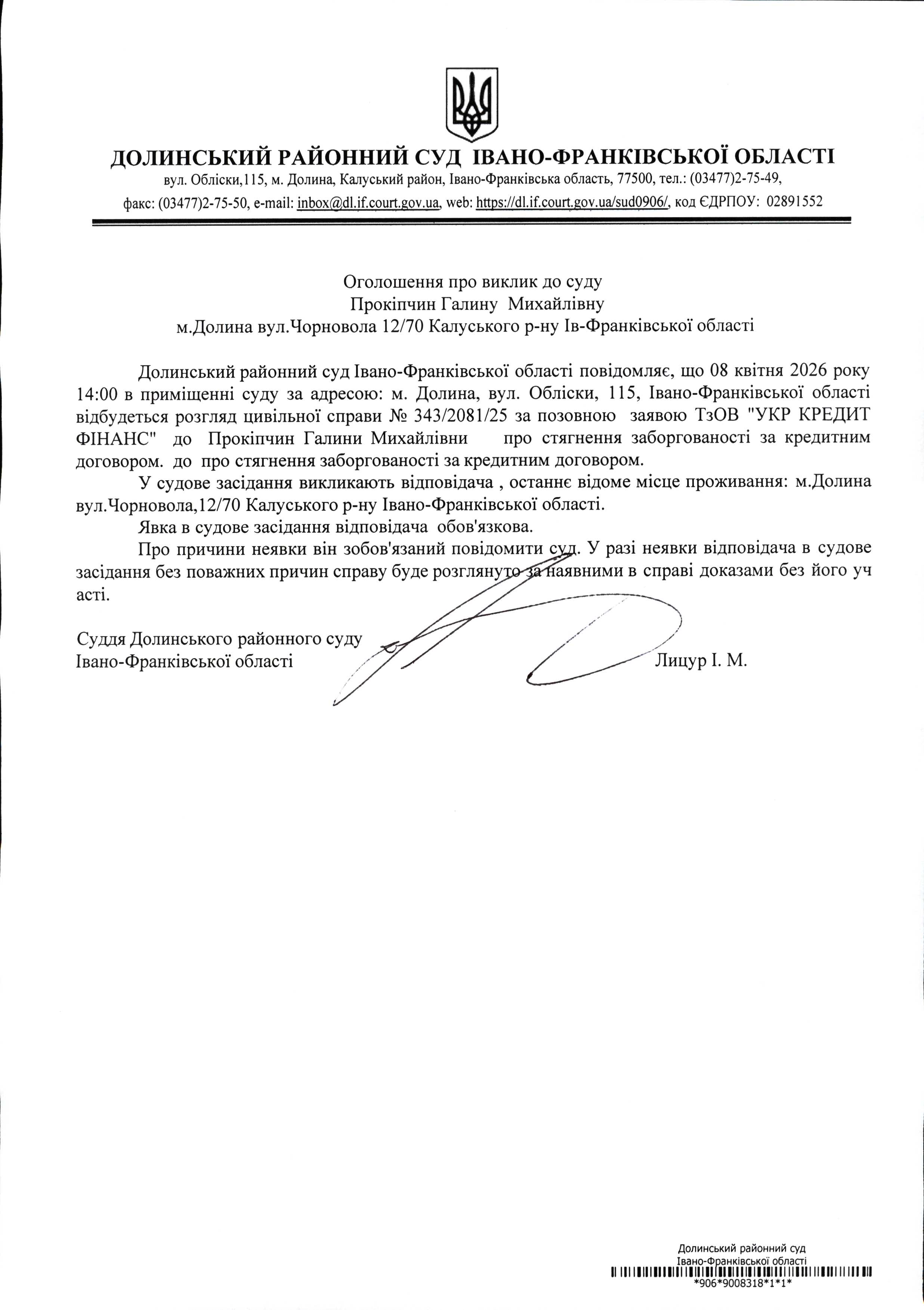 ОГОЛОШЕННЯ ПРО ВИКЛИК до СУДУ Прокіпчин Галину Михайлівну у цивільній справі № 343/2081/25