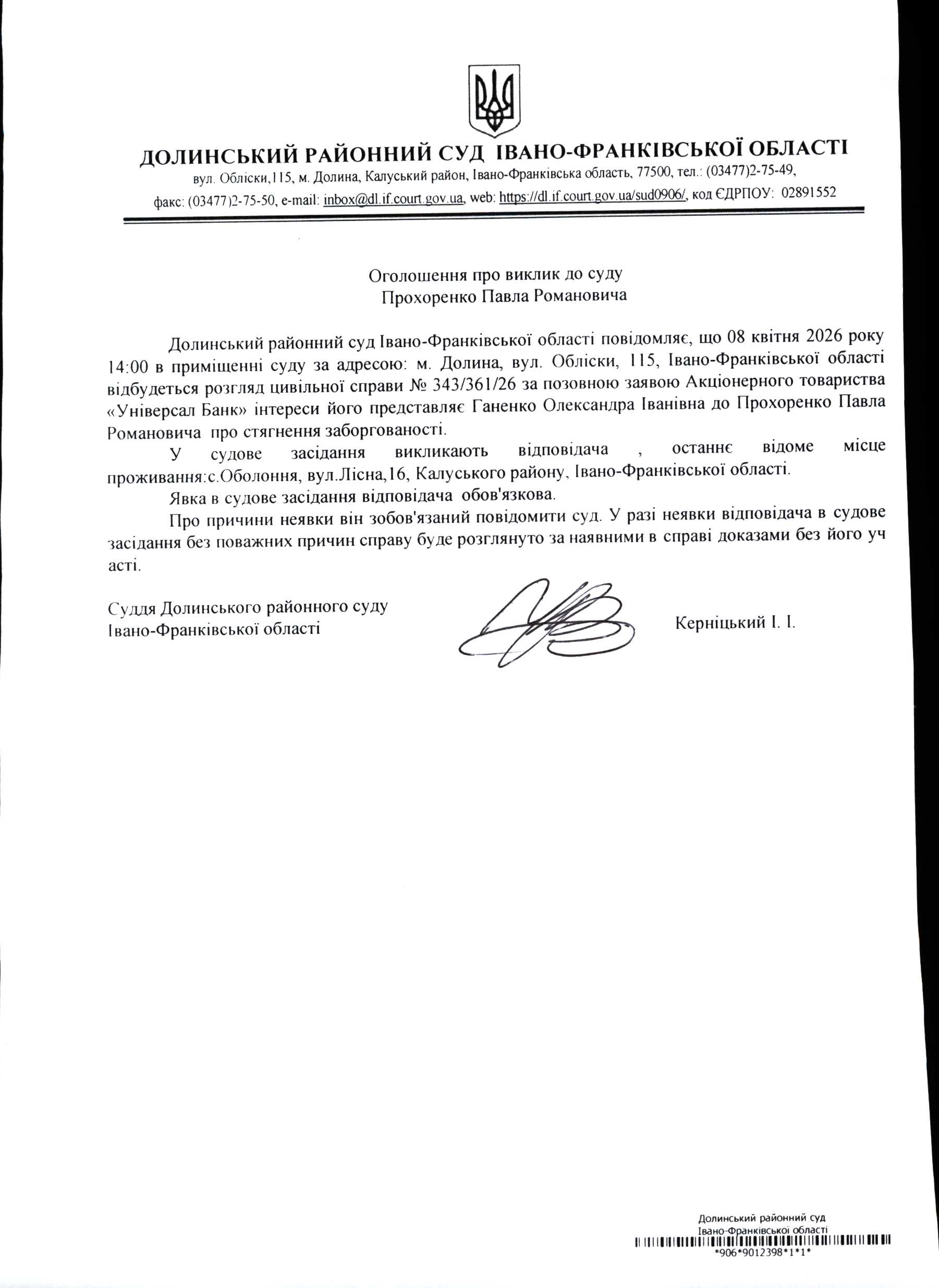 ОГОЛОШЕННЯ ПРО ВИКЛИК до СУДУ Прохоренко Павла Романовича у цивільній справі № 343/361/26