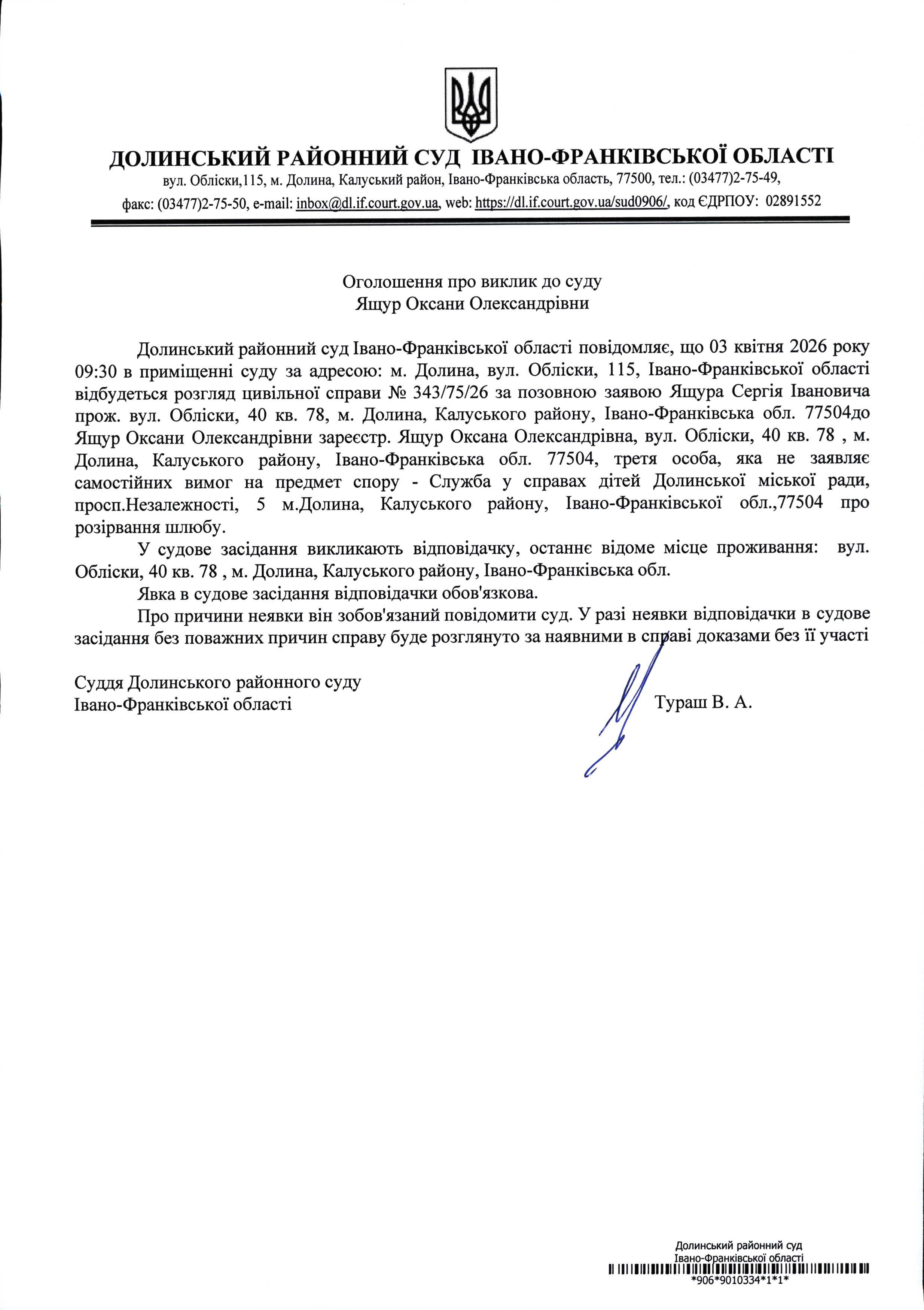 ОГОЛОШЕННЯ ПРО ВИКЛИК до СУДУ Ящур Оксани Олександрівни у цивільній справі № 343/75/26