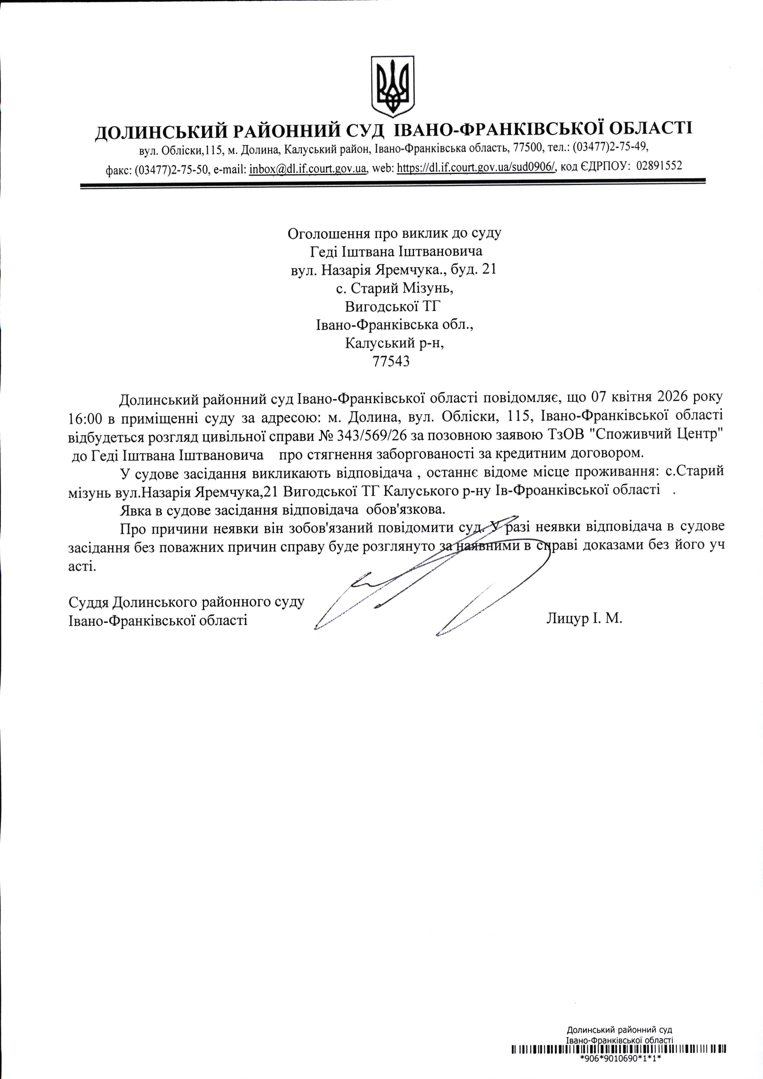 ОГОЛОШЕННЯ ПРО ВИКЛИК до СУДУ Геді Іштвана Іштвановича у цивільній справі № 343/569/26