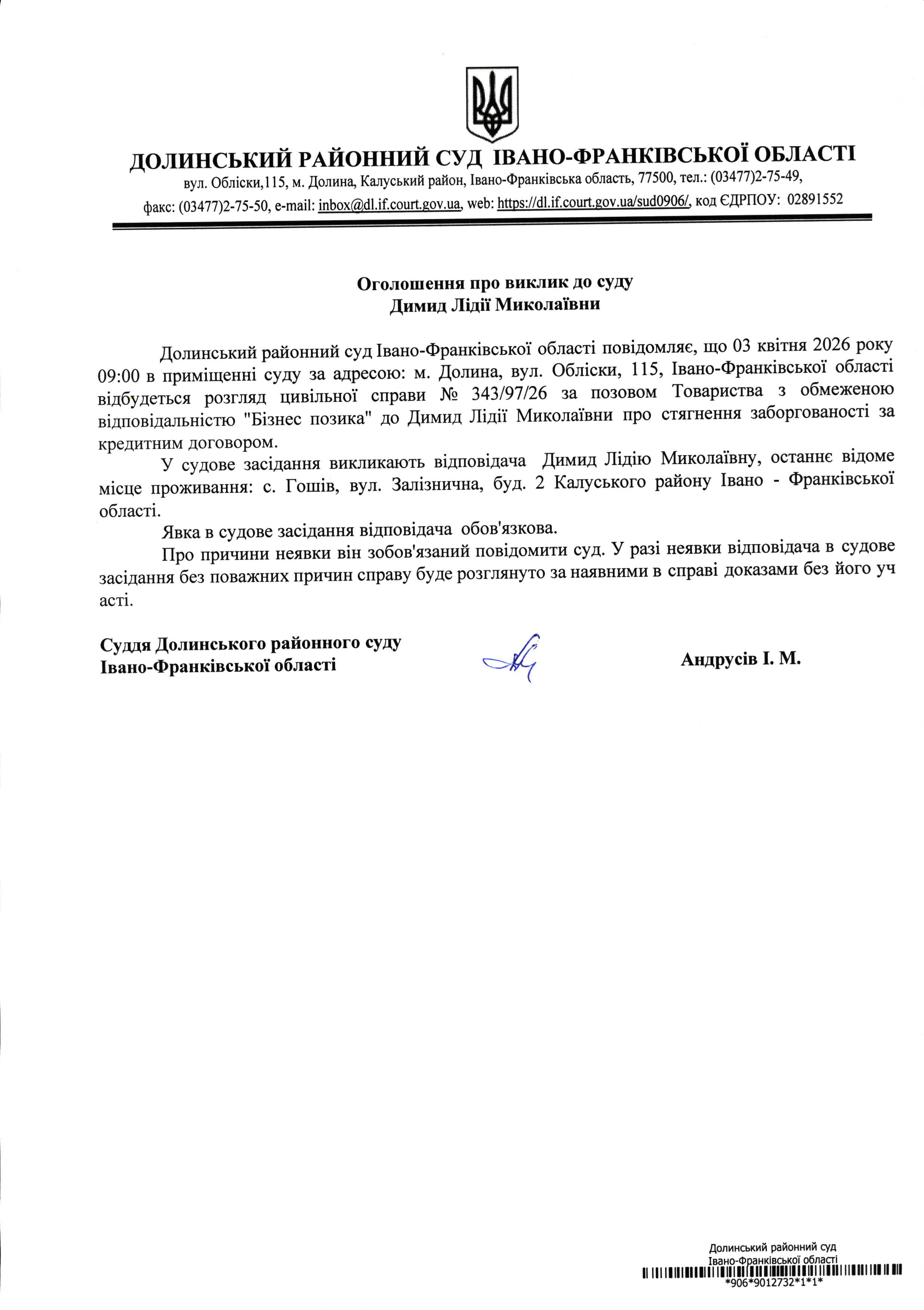 ОГОЛОШЕННЯ ПРО ВИКЛИК до СУДУ Димид Лідії Миколаївни у цивільній справі № 343/97/26