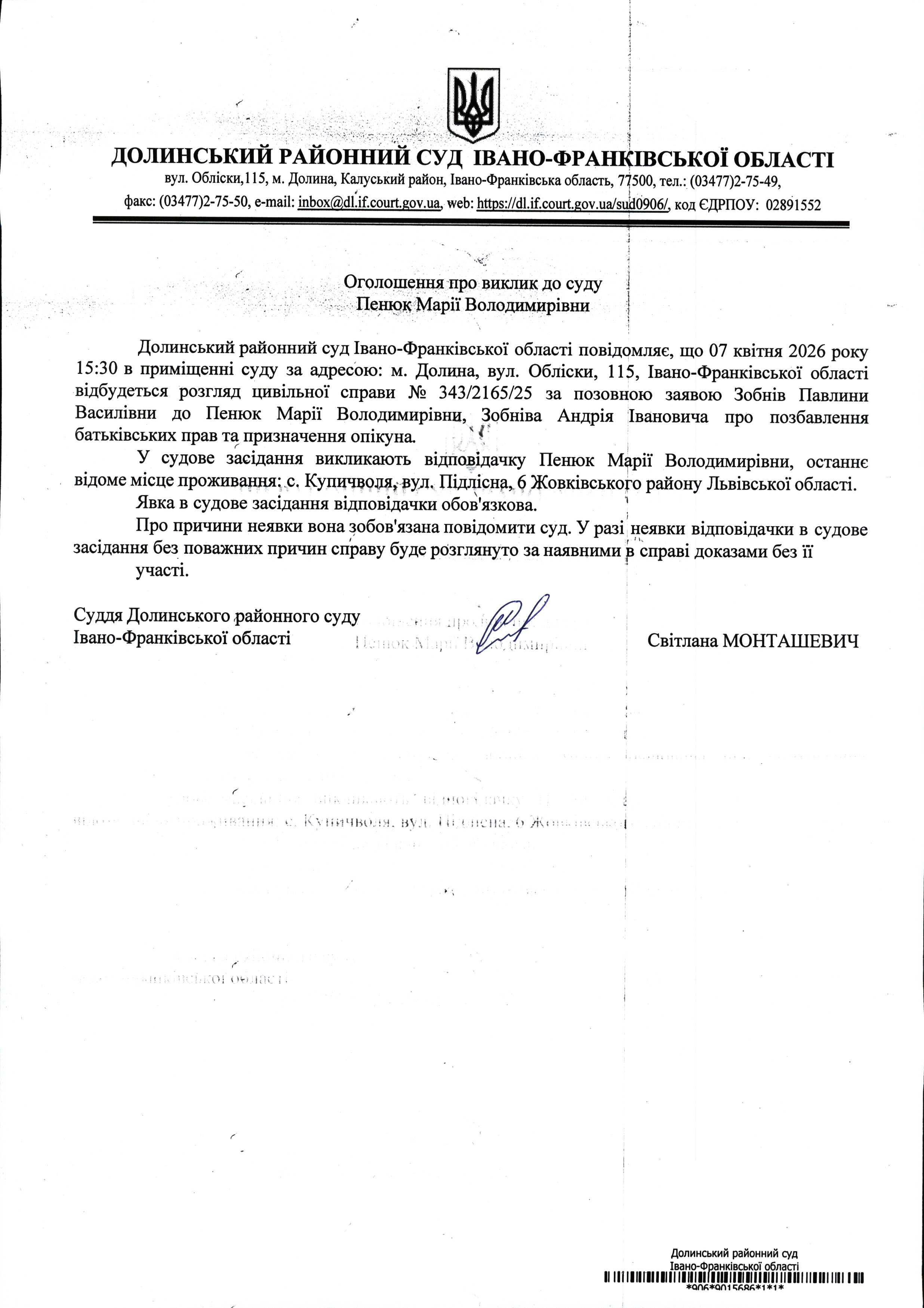 ОГОЛОШЕННЯ ПРО ВИКЛИК до СУДУ Пенюк Марії Володимирівни у цивільній справі № 343/2165/25
