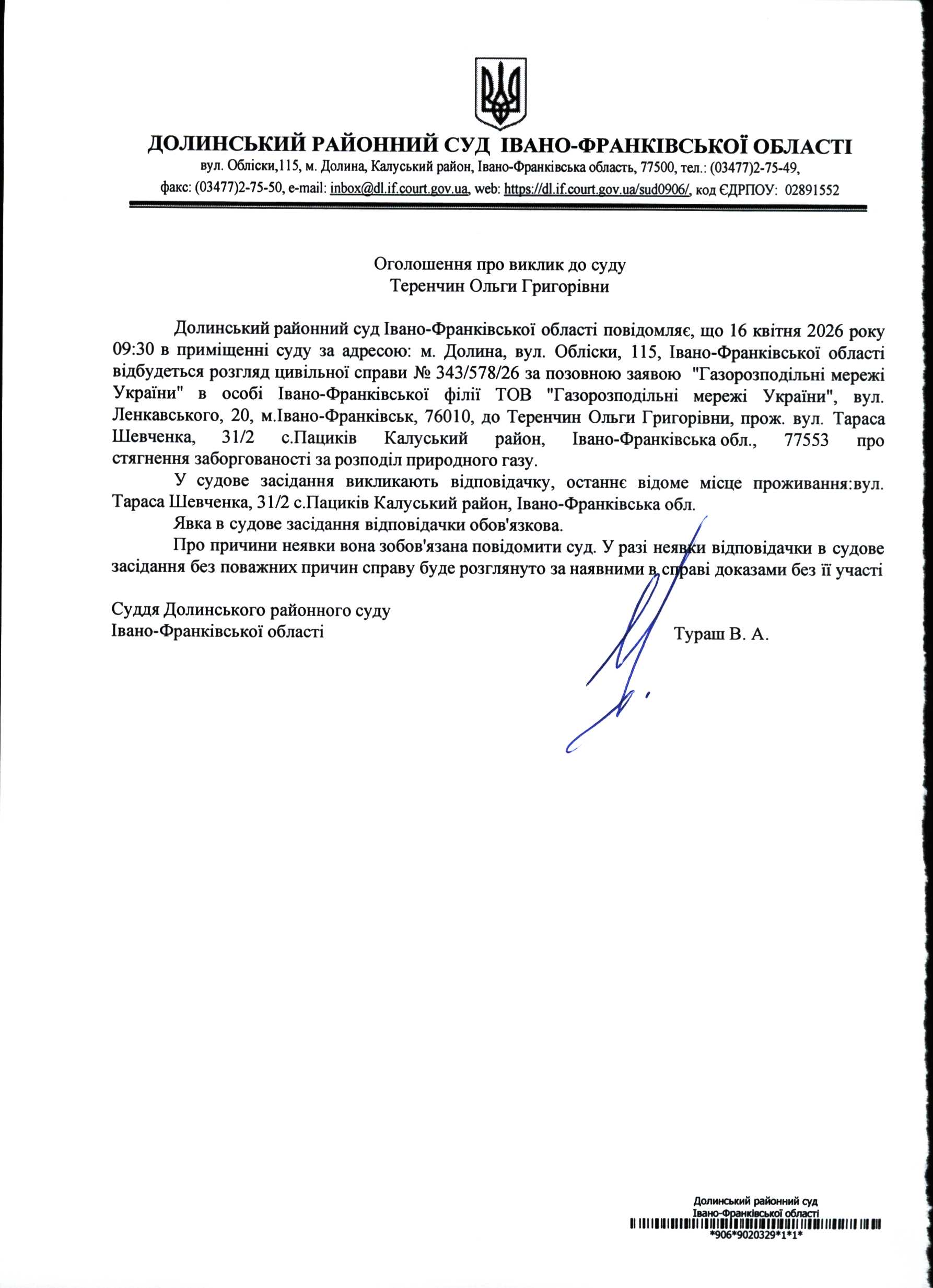 ОГОЛОШЕННЯ ПРО ВИКЛИК до СУДУ Теренчин Ольги Григорівни у цивільній справі № 343/578/26