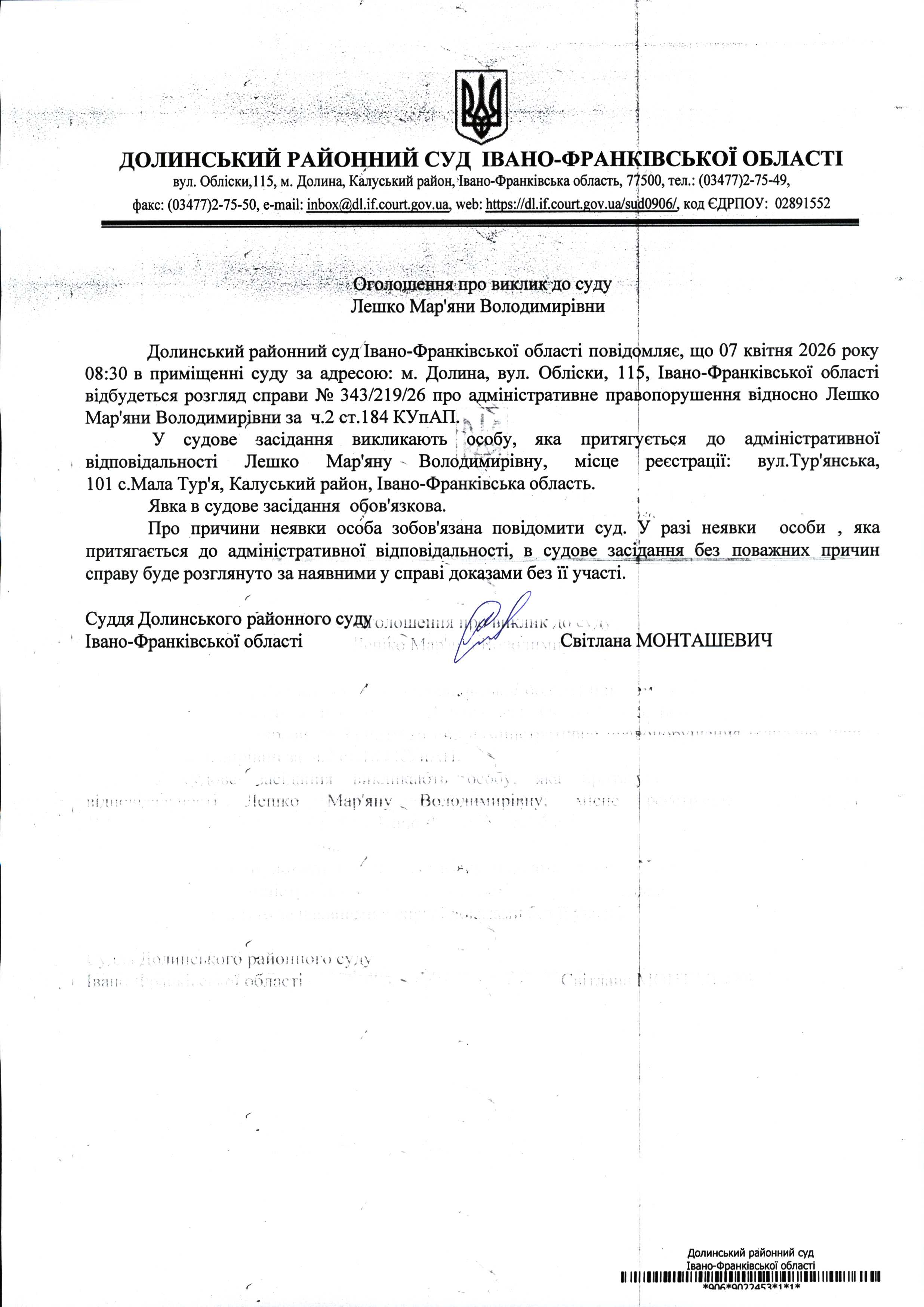 ОГОЛОШЕННЯ ПРО ВИКЛИК до СУДУ Лешко Мар'яни Володимирівни у справі про адміністративне № 343/219/26