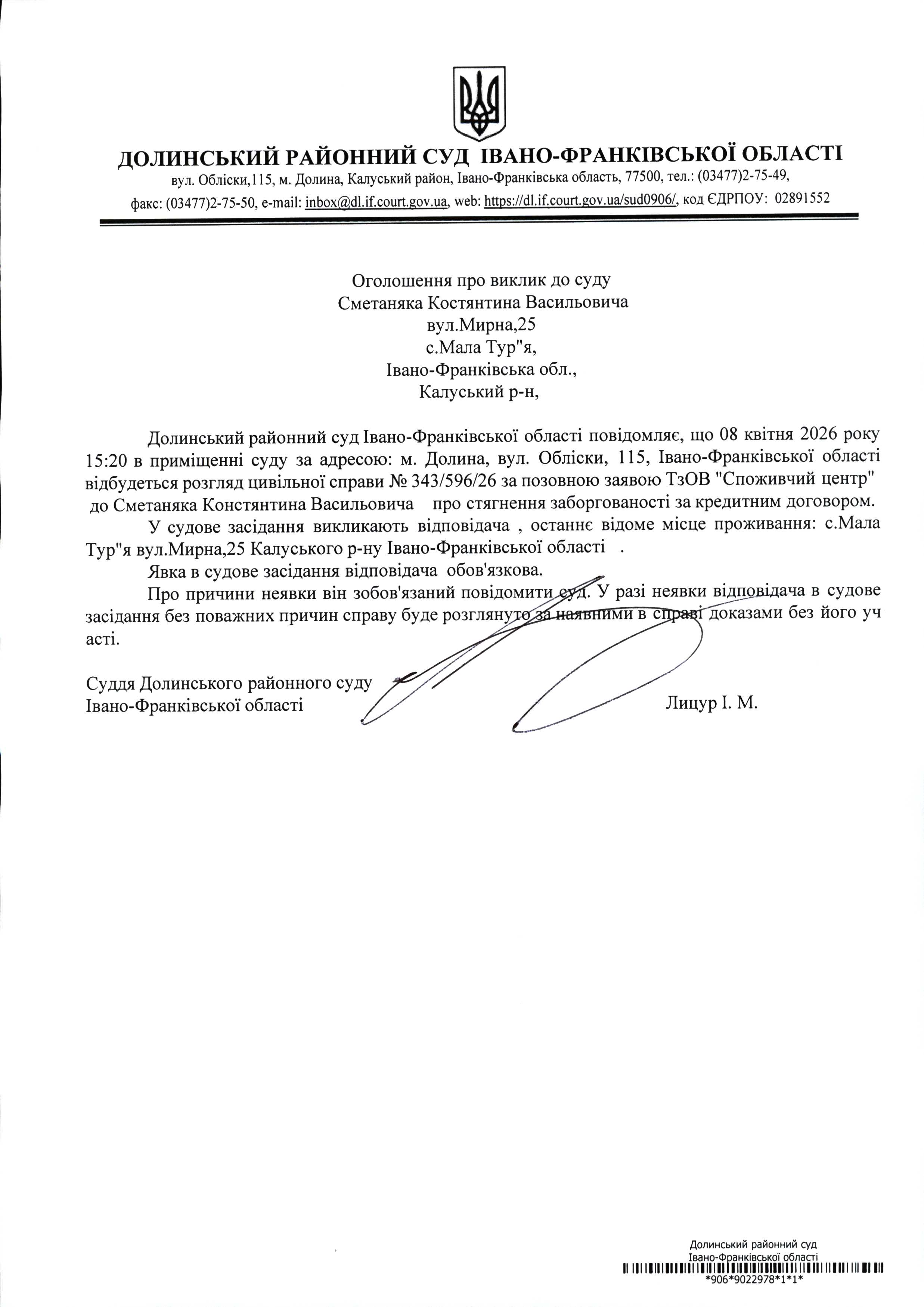 ОГОЛОШЕННЯ ПРО ВИКЛИК до СУДУ Сметаняка Констянтина Васильовича у цивільній справі № 343/596/26