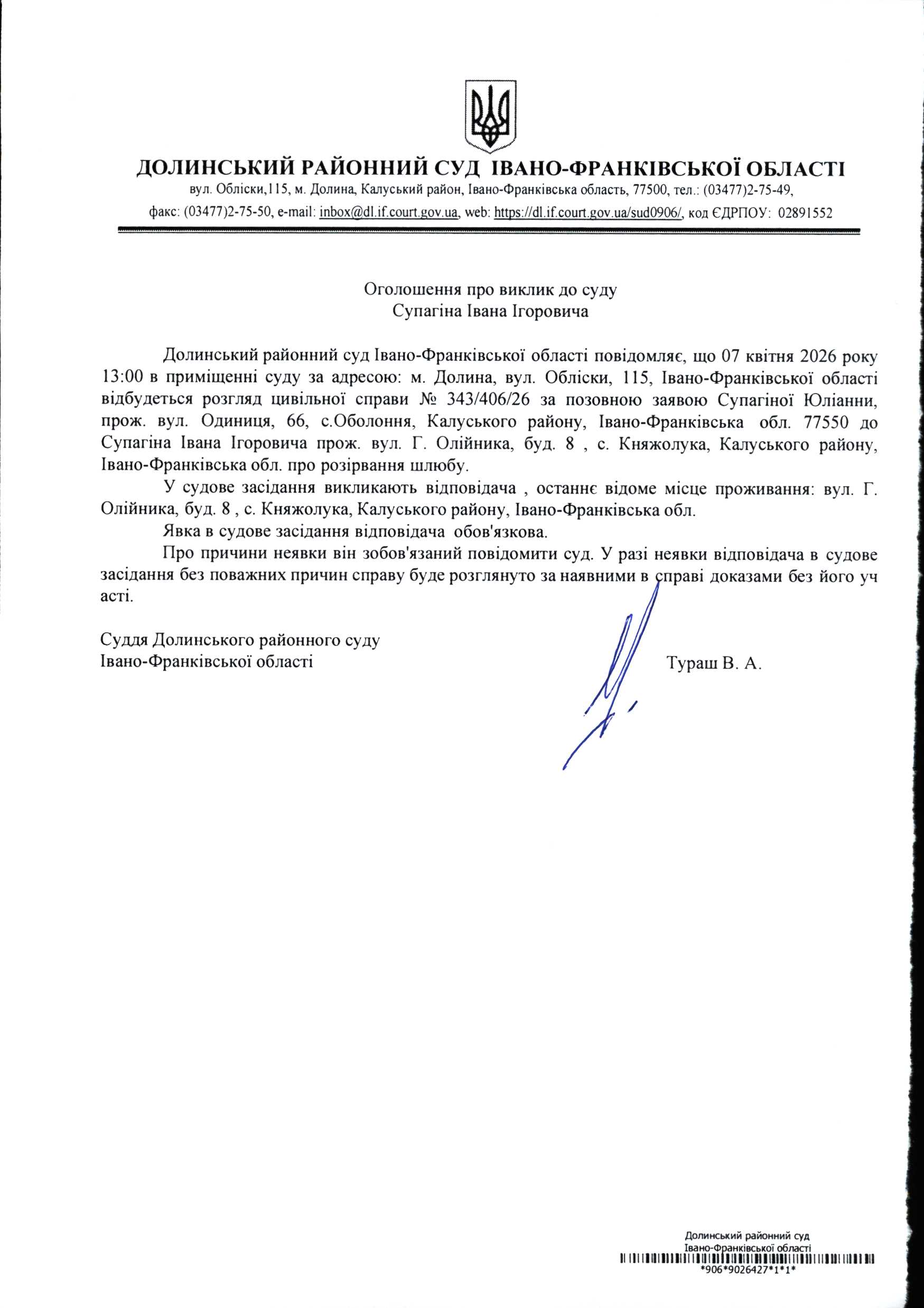 ОГОЛОШЕННЯ ПРО ВИКЛИК до СУДУ Супагіна Івана Ігоровича у цивільній справі № 343/406/26