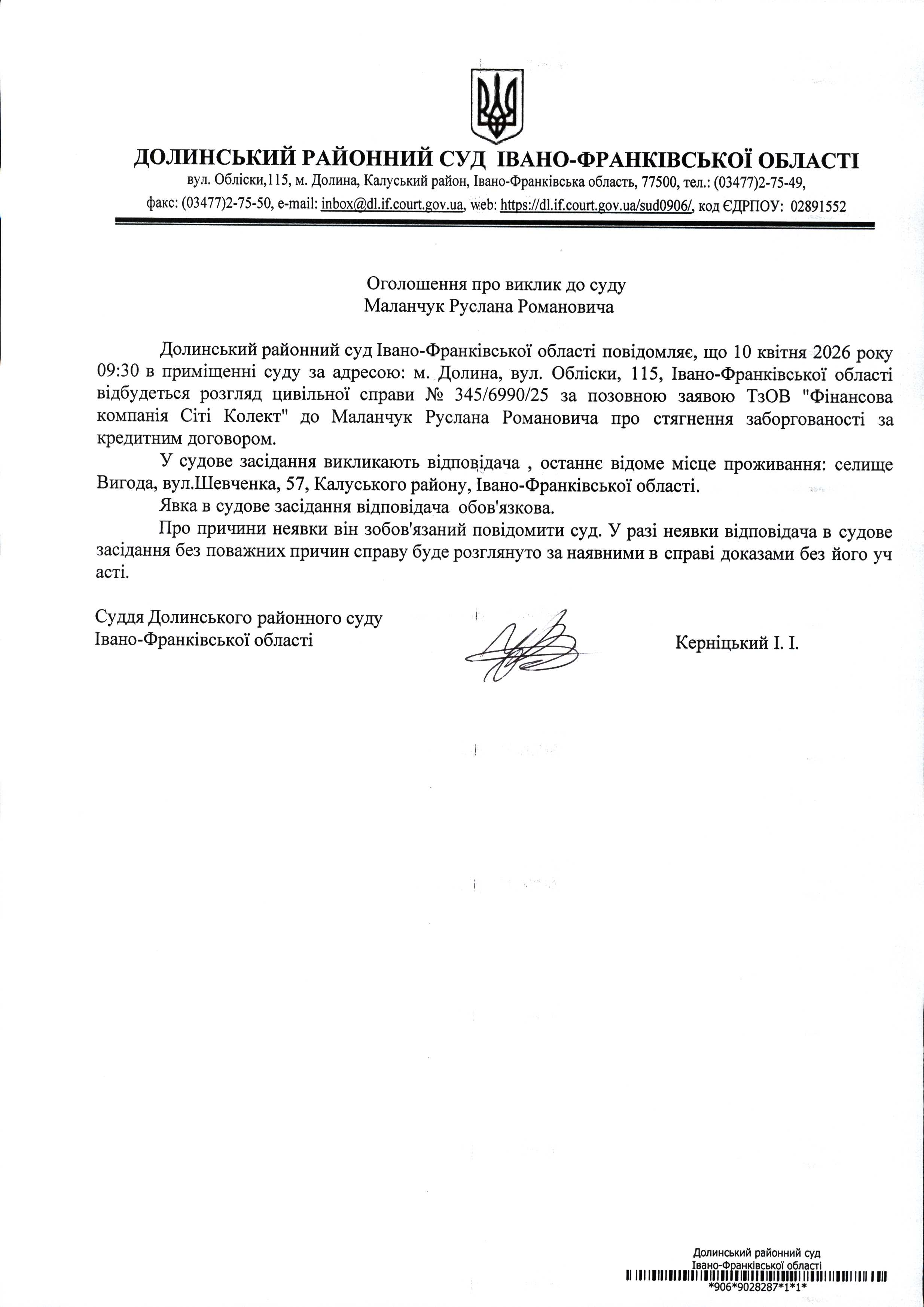 ОГОЛОШЕННЯ ПРО ВИКЛИК до СУДУ Маланчук Руслана Романовича у цивільній справі № 345/6990/25