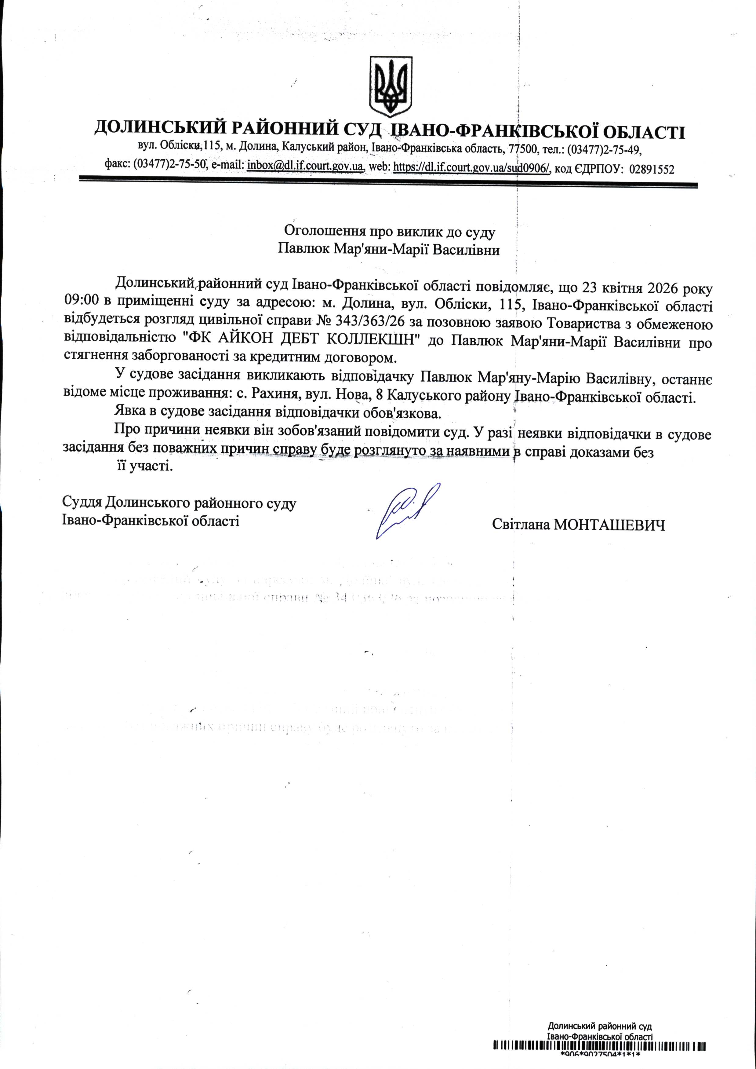 ОГОЛОШЕННЯ ПРО ВИКЛИК до СУДУ Павлюк Мар'яни-Марії Василівни у цивільній справі № 343/363/26