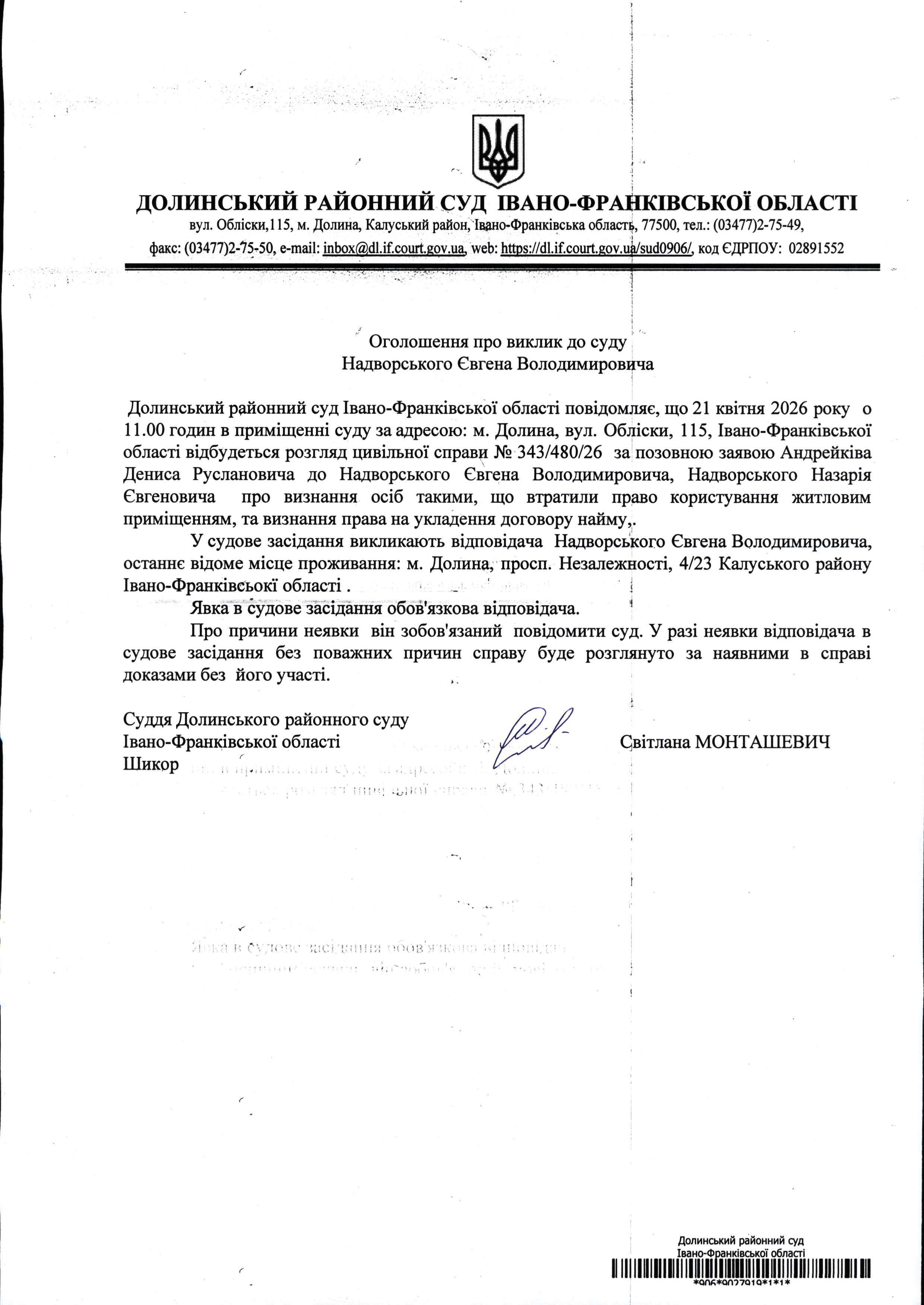 ОГОЛОШЕННЯ ПРО ВИКЛИК до СУДУ Надворського Євгена Володимировича у цивільній справі № 343/480/26