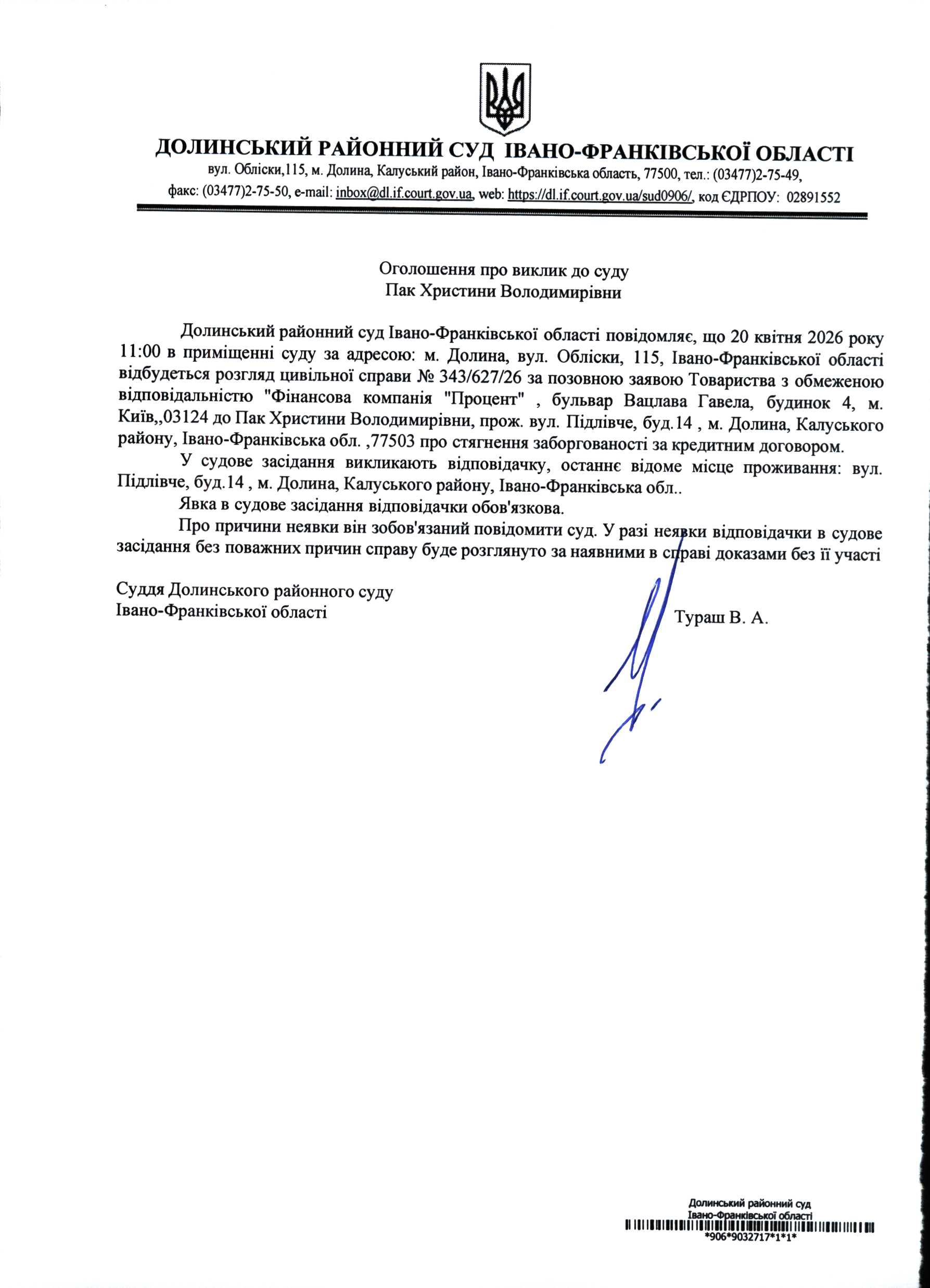 ОГОЛОШЕННЯ ПРО ВИКЛИК до СУДУ Пак Христини Володимирівни у цивільній справі № 343/627/26