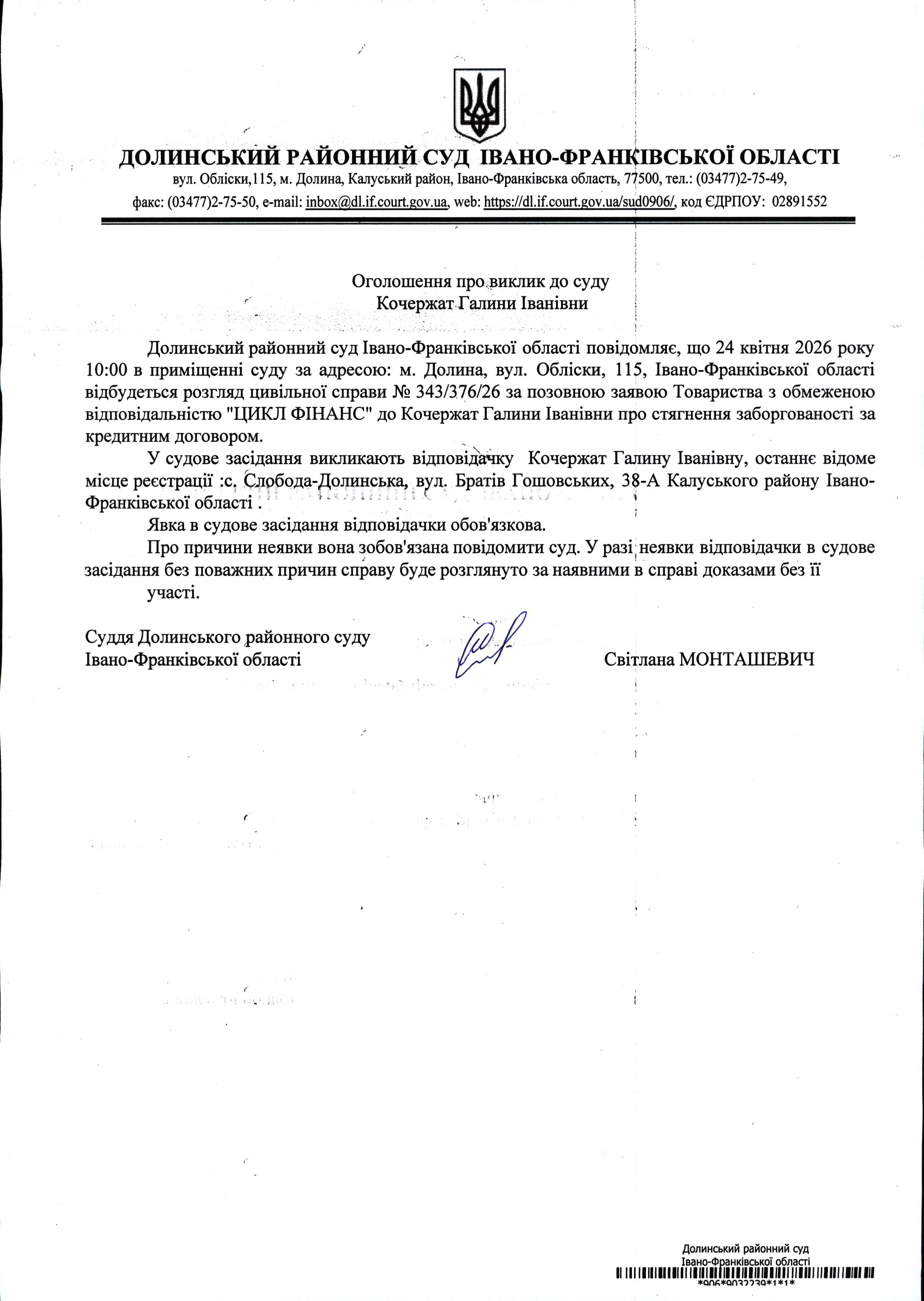 ОГОЛОШЕННЯ ПРО ВИКЛИК до СУДУ Кочержат Галини Іванівни у цивільній справі № 343/376/26