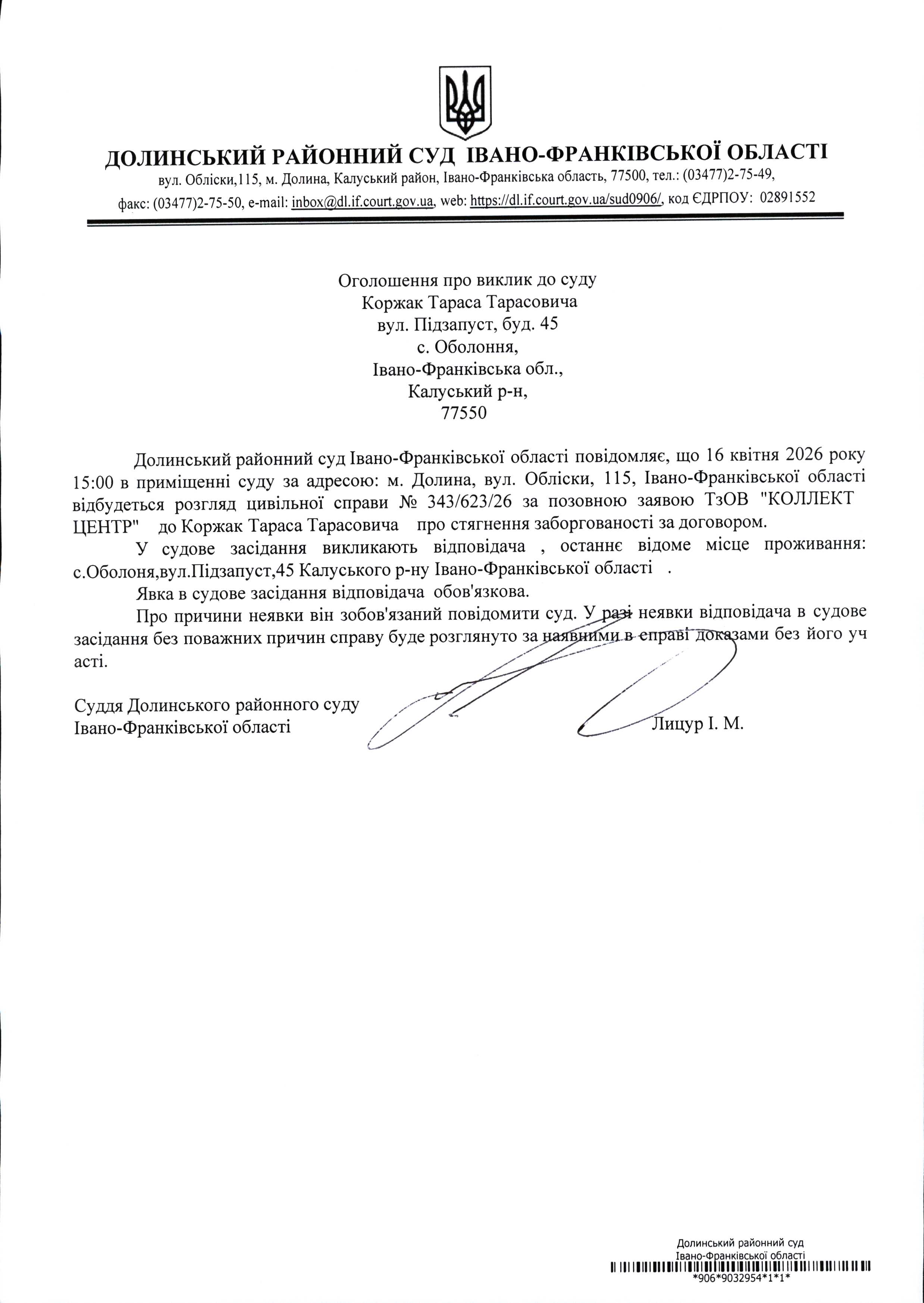 ОГОЛОШЕННЯ ПРО ВИКЛИК до СУДУ Коржак Тараса Тарасовича у цивільній справі № 343/623/26