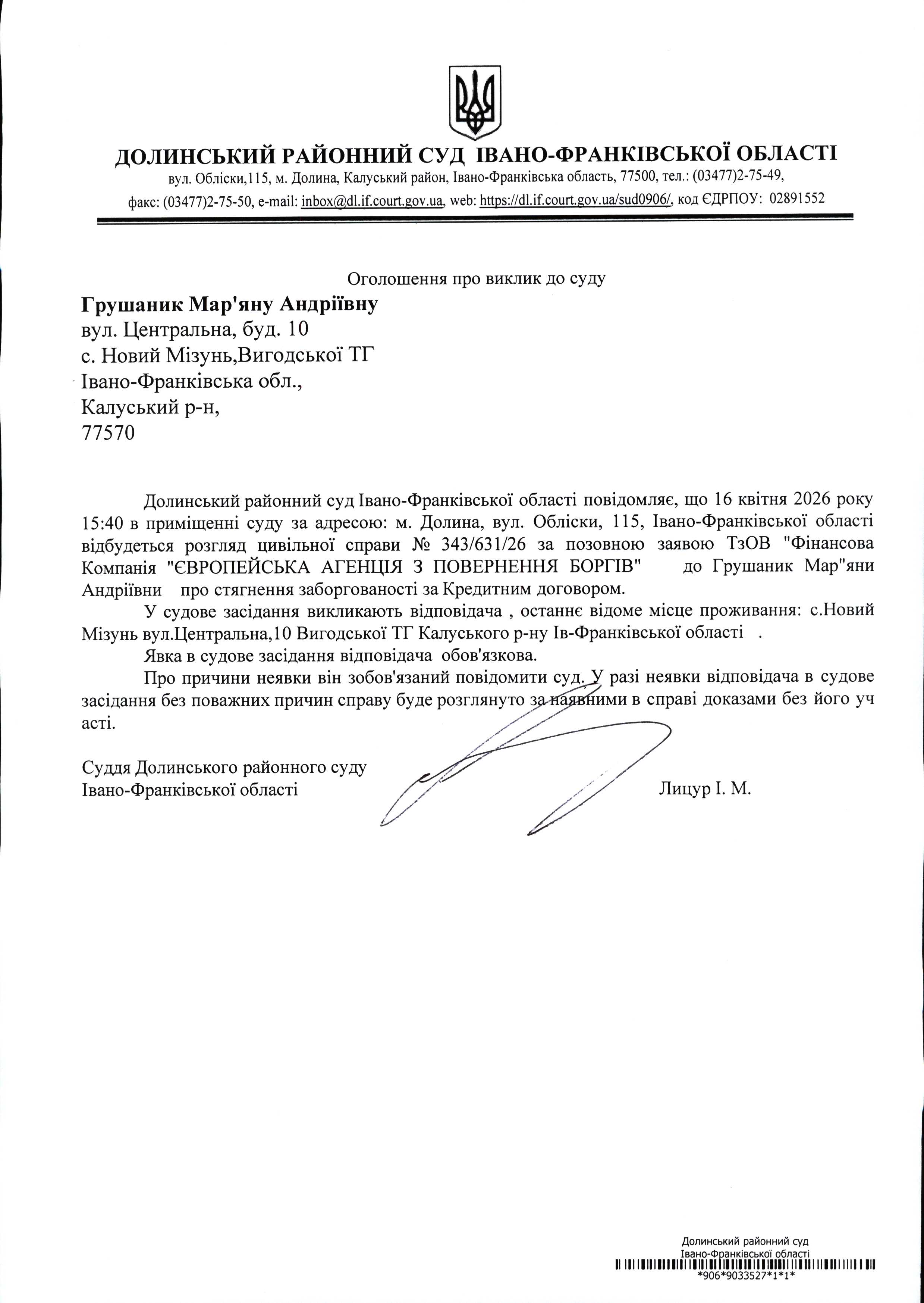 ОГОЛОШЕННЯ ПРО ВИКЛИК до СУДУ Грушаник Мар'яну Андріївну у цивільній справі № 343/631/26