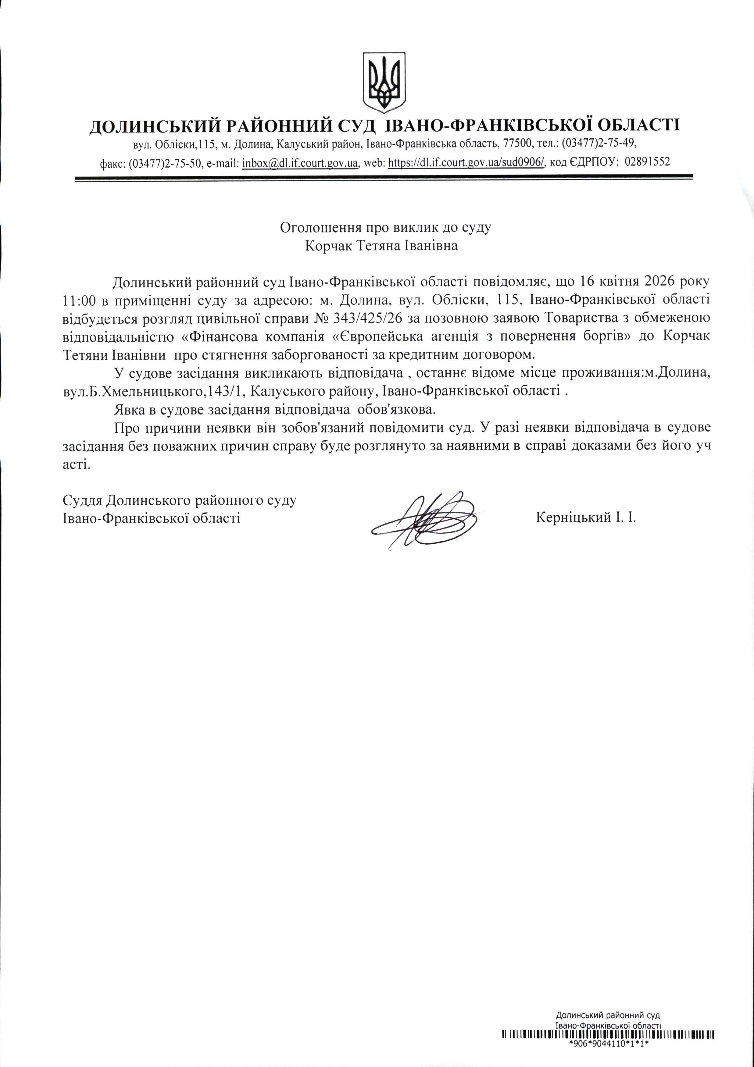 ОГОЛОШЕННЯ ПРО ВИКЛИК до СУДУ Корчак Тетяни Іванівни у цивільній справі № 343/425/26