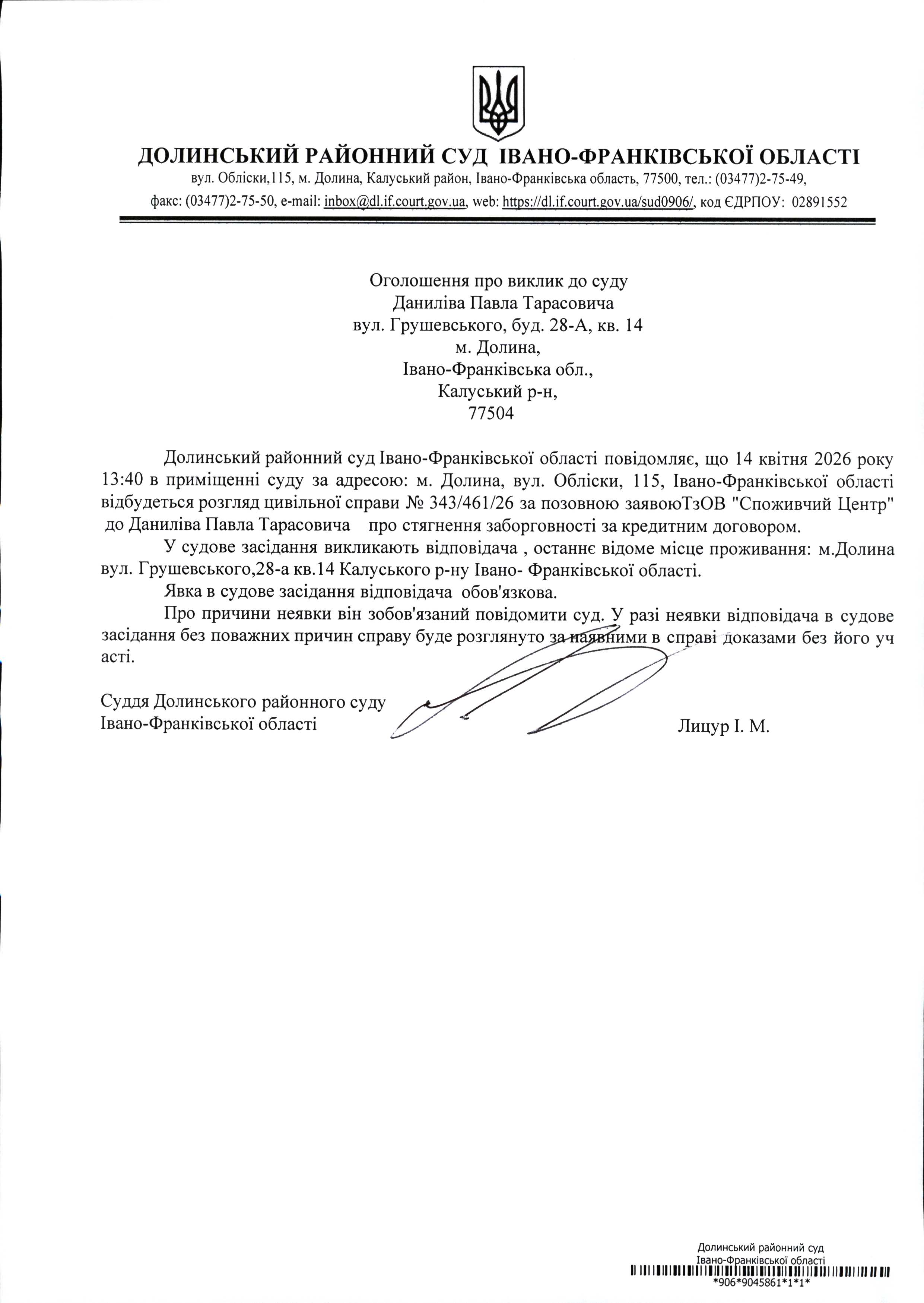 ОГОЛОШЕННЯ ПРО ВИКЛИК до СУДУ Даниліва Павла Тарасовича у цивільній справі № 343/461/26