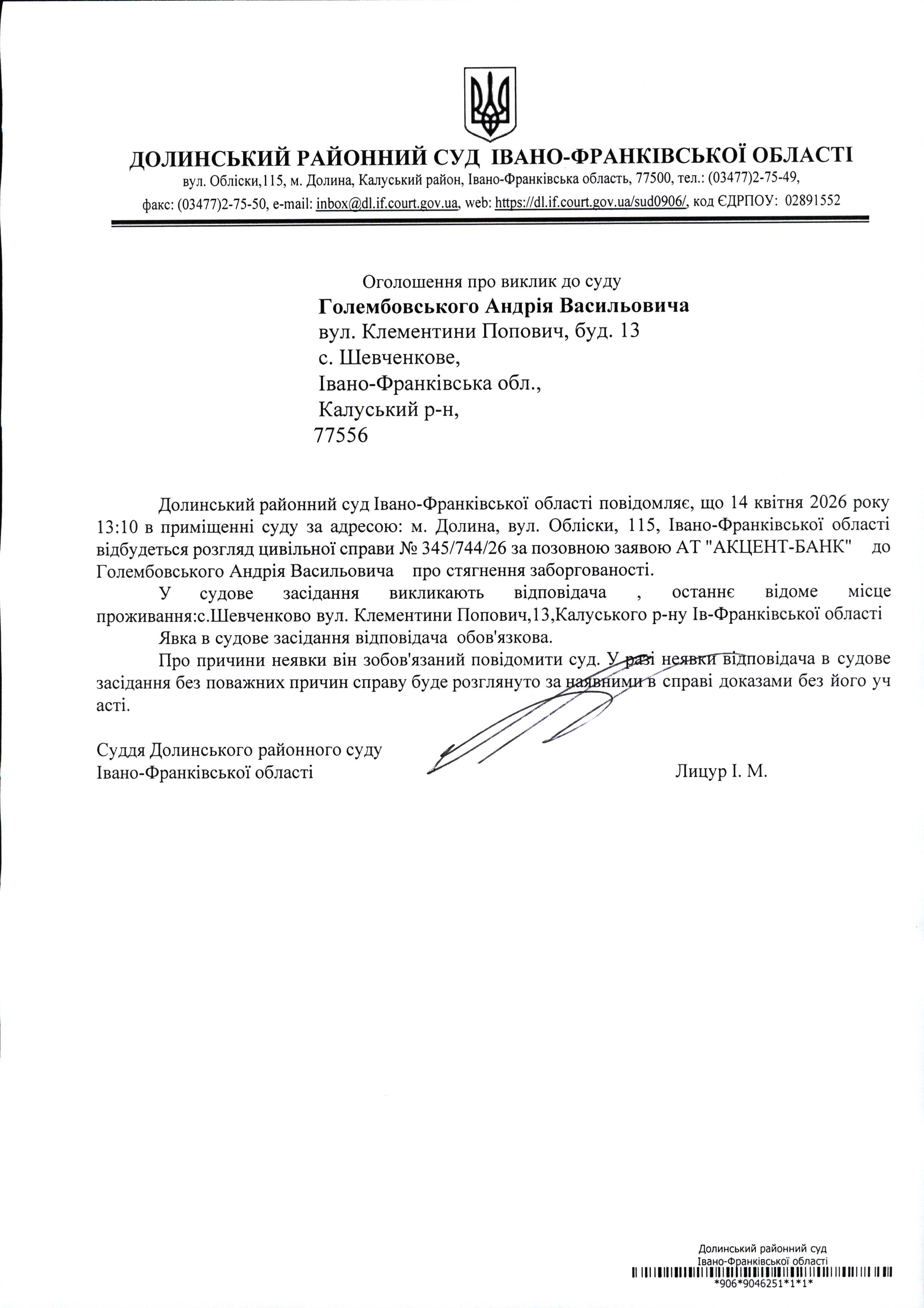 ОГОЛОШЕННЯ ПРО ВИКЛИК до СУДУ Голембовського Андрія Васильовича у цивільній справі № 345/744/26