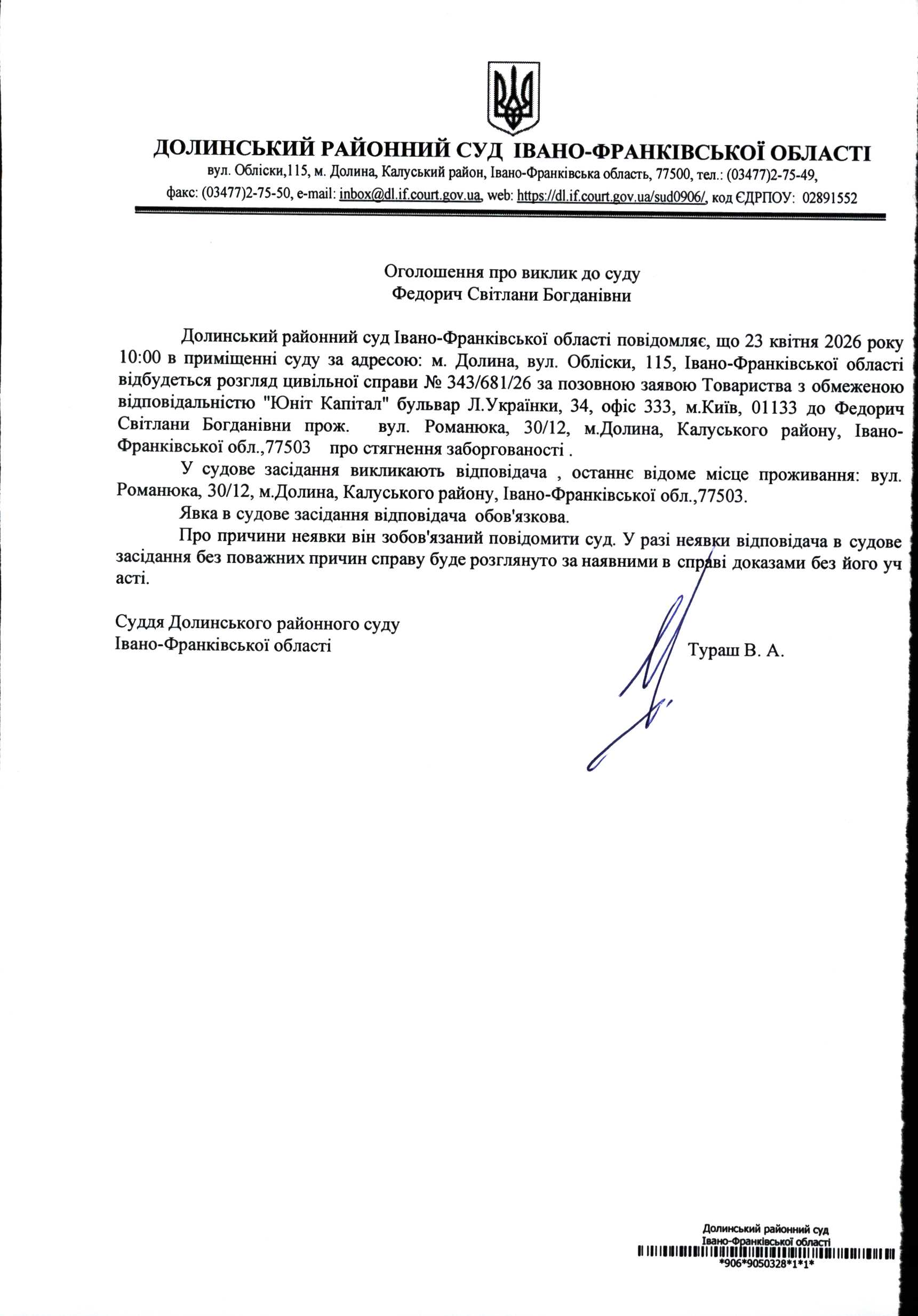 ОГОЛОШЕННЯ ПРО ВИКЛИК до СУДУ Федорич Світлани Богданівни у цивільній справі № 343/681/26