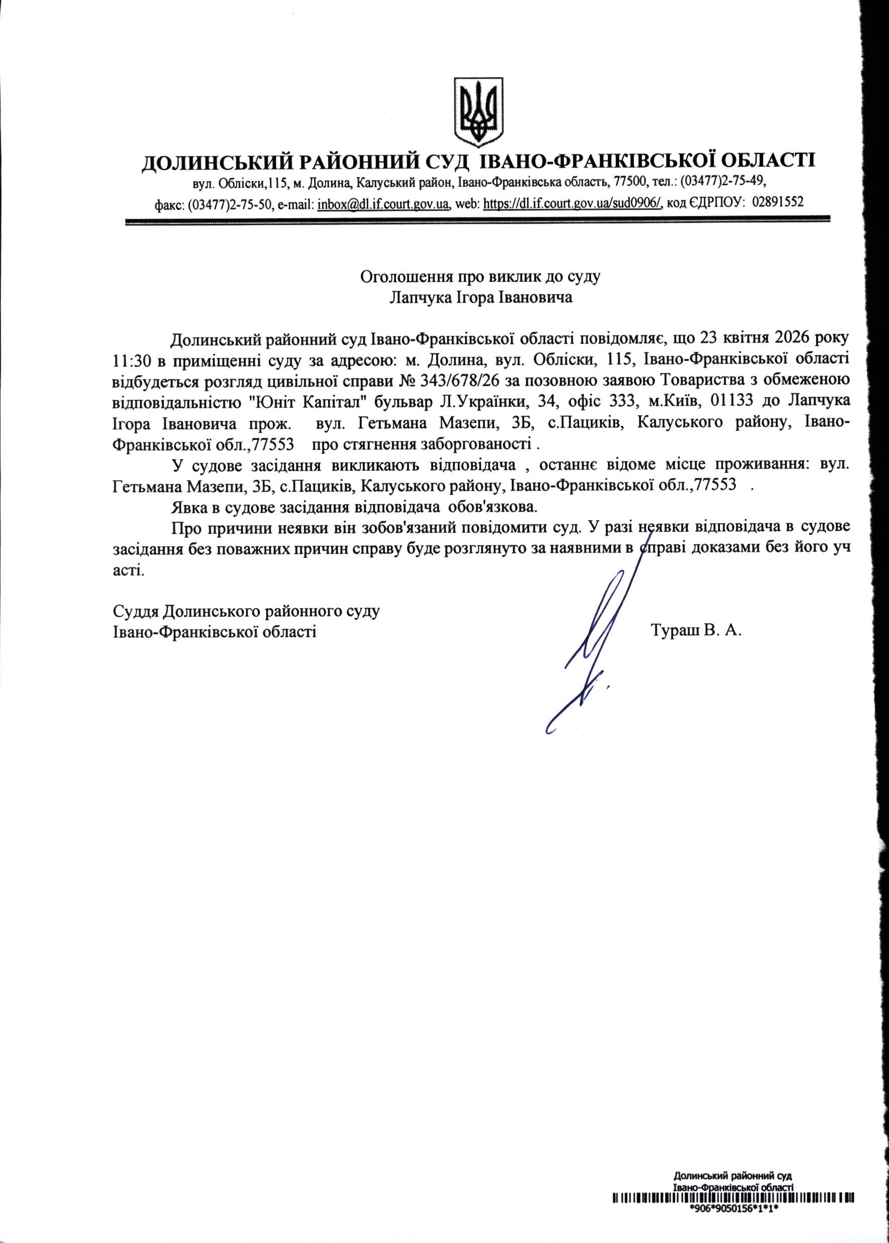 ОГОЛОШЕННЯ ПРО ВИКЛИК до СУДУ Лапчука ІгораІвановича у цивільній справі № 343/678/26