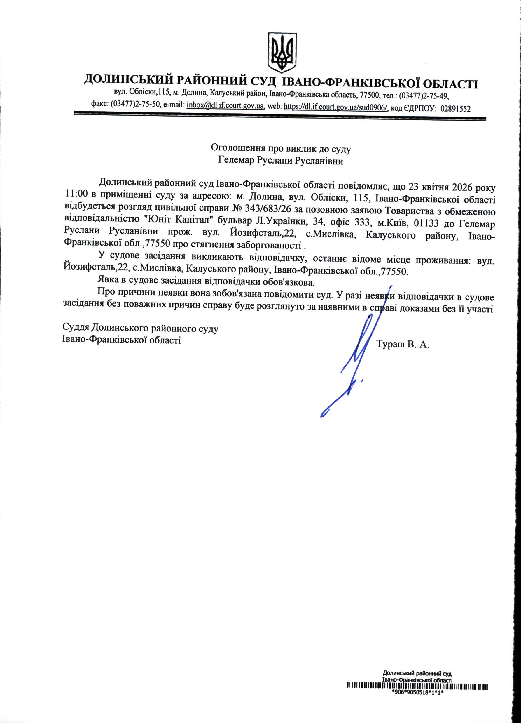 ОГОЛОШЕННЯ ПРО ВИКЛИК до СУДУ Гелемар Руслани Русланівни у цивільній справі № 343/683/26