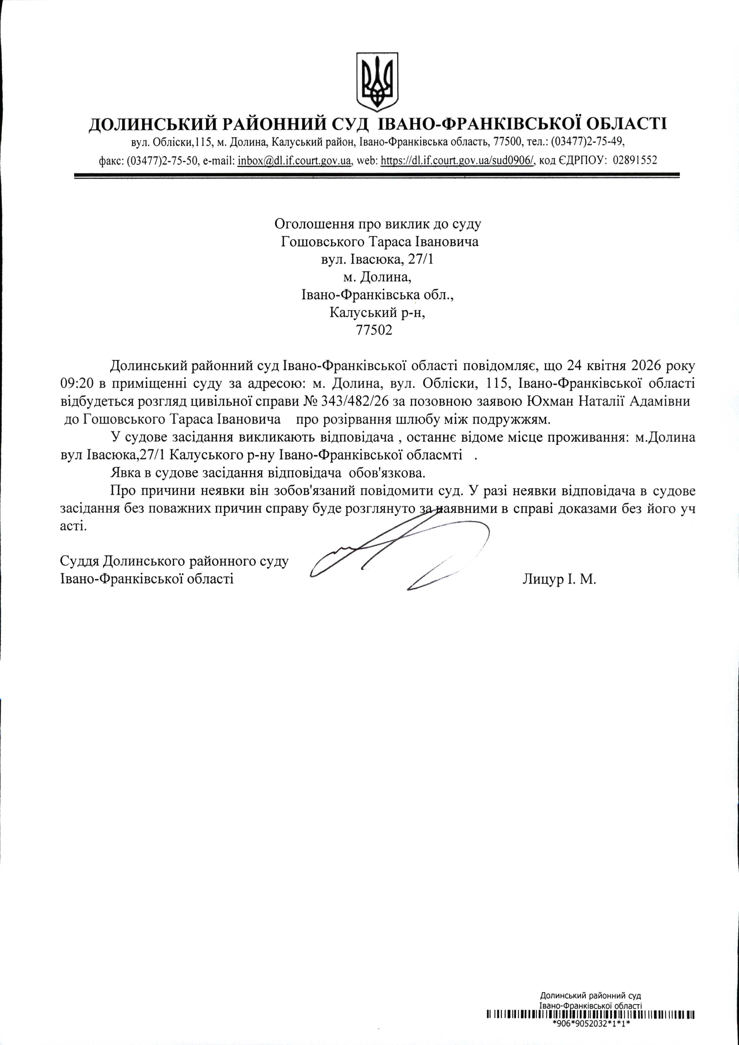 ОГОЛОШЕННЯ ПРО ВИКЛИК до СУДУ Гошовського Тараса Івановича у цивільній справі № 343/482/26