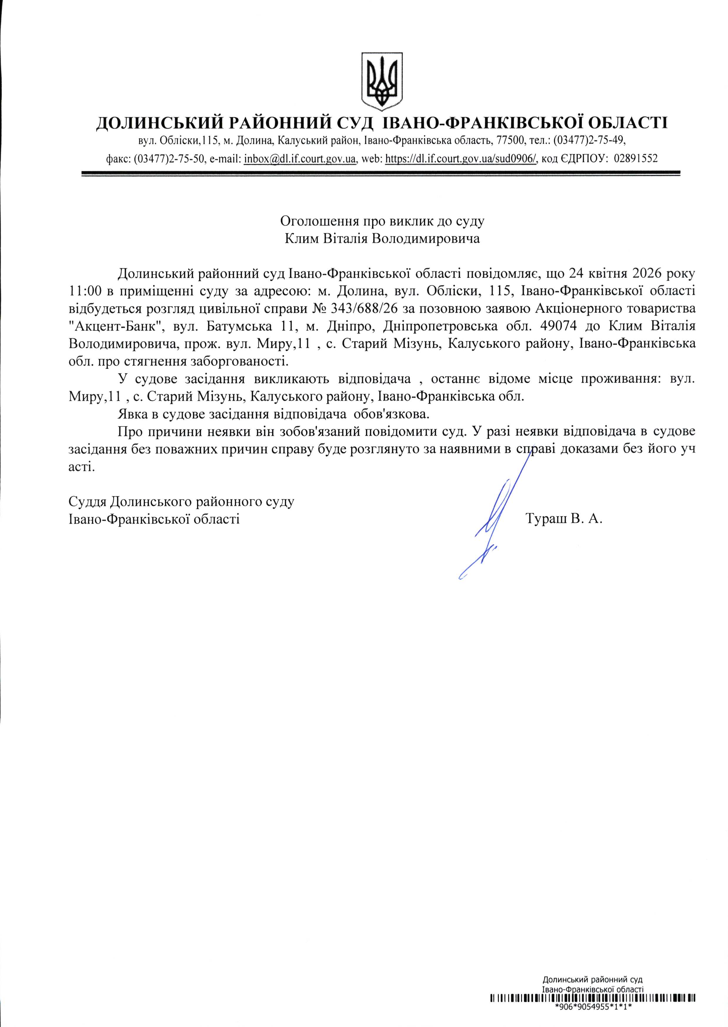 ОГОЛОШЕННЯ ПРО ВИКЛИК до СУДУ Клим Віталія Володимировича у цивільній справі № 343/688/26