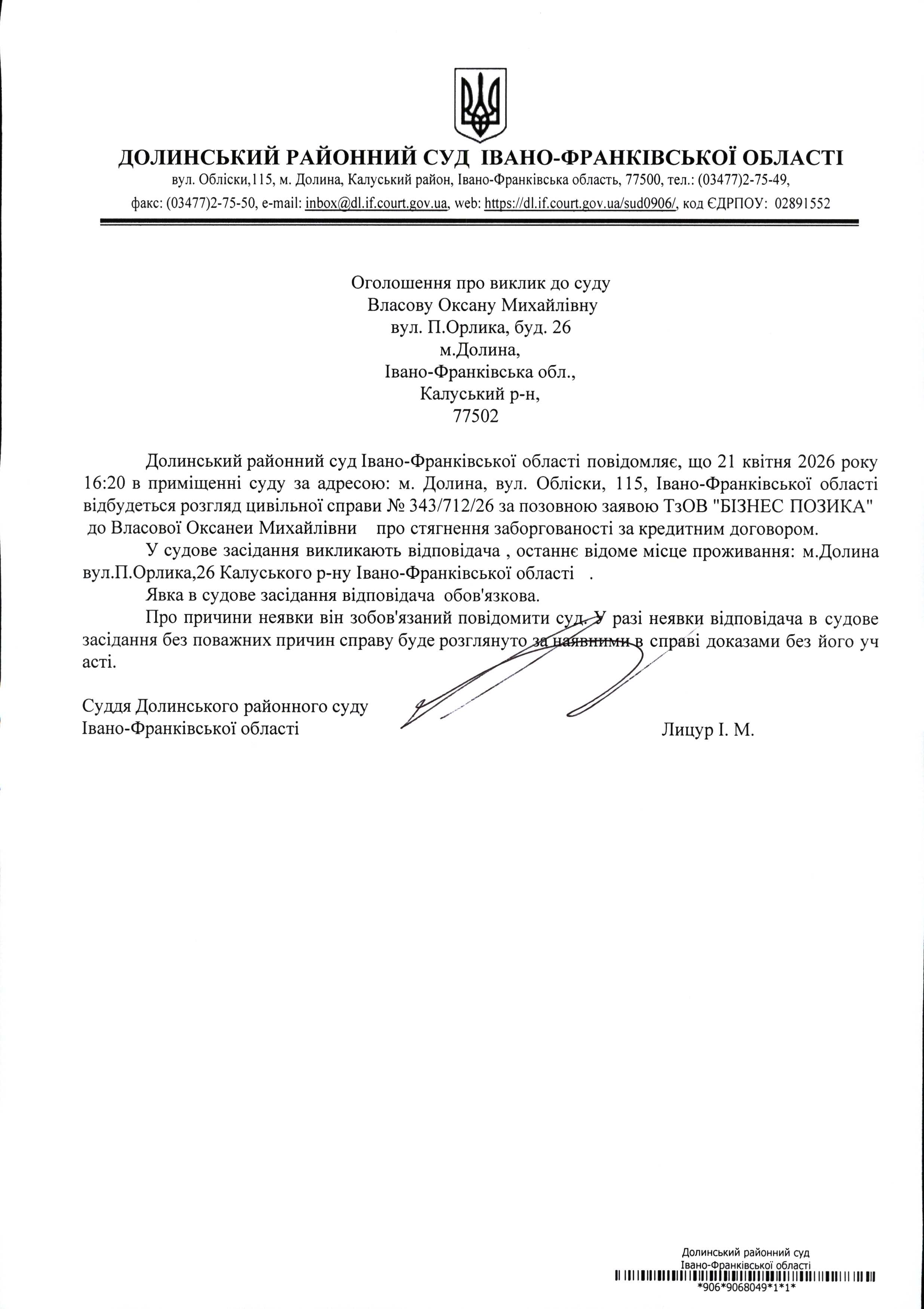 ОГОЛОШЕННЯ ПРО ВИКЛИК до СУДУ Власову Оксану Михайлівну у цивільній справі № 343/712/26
