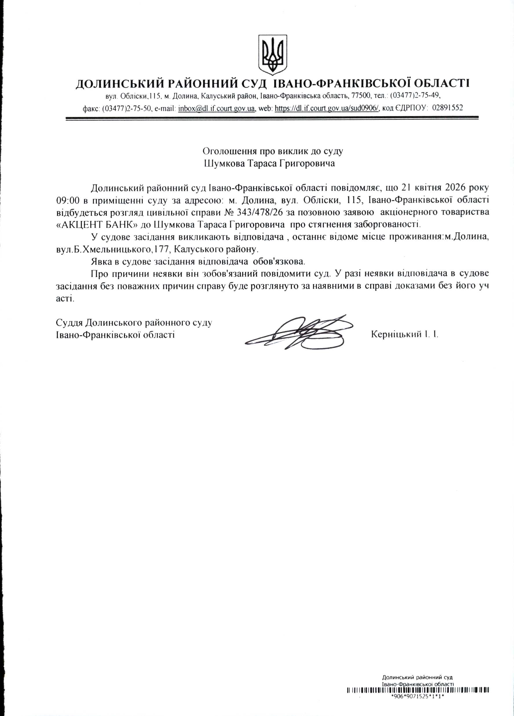 ОГОЛОШЕННЯ ПРО ВИКЛИК до СУДУ Шумкова Тараса Григоровича у цивільній справі № 343/478/26